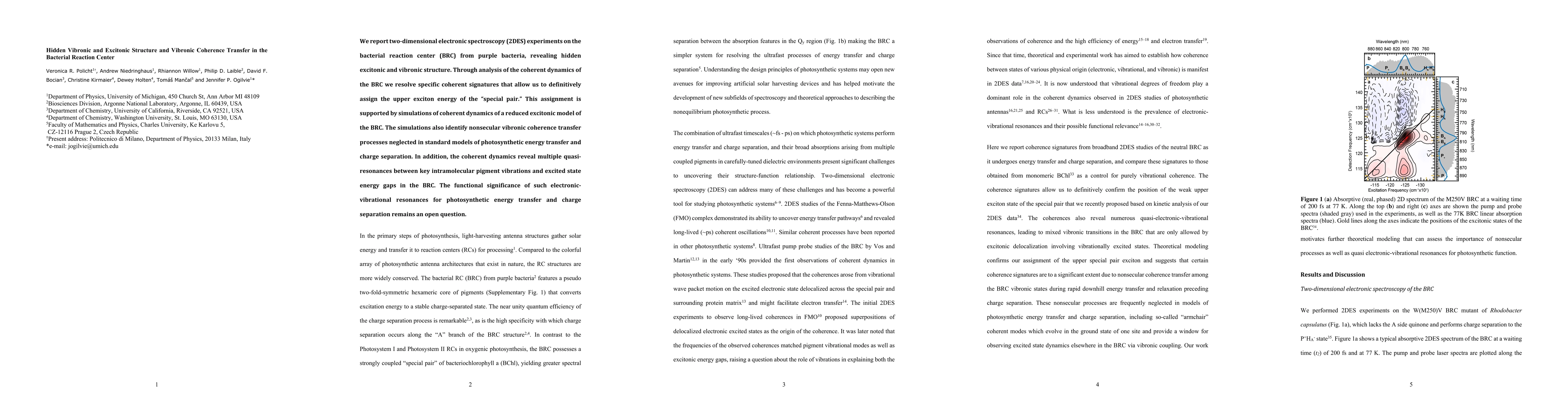 Researchers used 2D electronic spectroscopy to study the bacterial reaction center, revealing hidden excitonic and vibronic structure. The findings show specific coherent signatures that assign the upper exciton energy of the 'special pair' and identify non-secular vibronic coherence transfer processes.