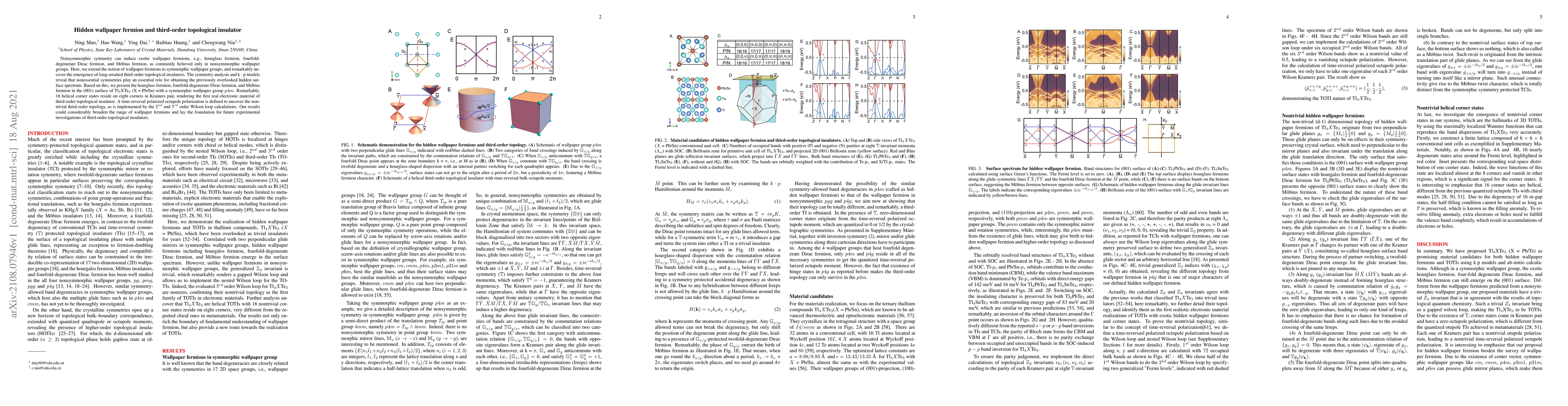 This paper extends the concept of wallpaper fermions to symmorphic wallpaper groups, revealing the existence of third-order topological insulators. It identifies exotic fermions such as hourglass, fourfold-degenerate Dirac, and Möbius fermions in the (001) surface of Tl$_4$XTe$_3$ (X = Pb/Sn), establishing it as the first electronic material exhibiting third-order topological insulating behavior with time-reversal polarized octupole polarization.