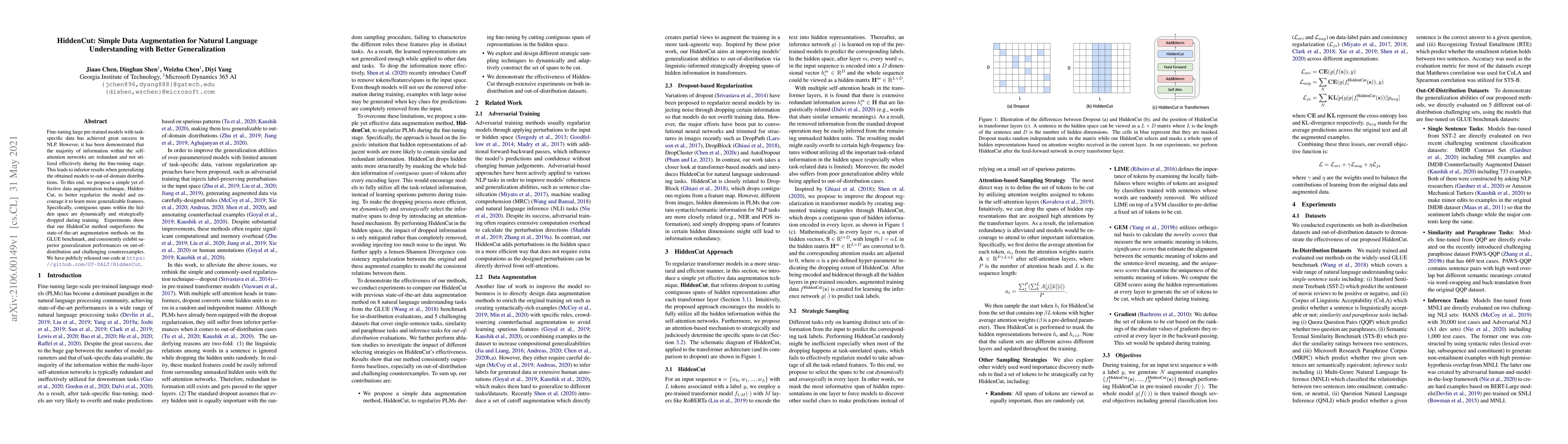 A new data augmentation technique called HiddenCut is proposed to improve natural language understanding models' generalization performance. It achieves better results on the GLUE benchmark and outperforms state-of-the-art methods on out-of-distribution tasks.