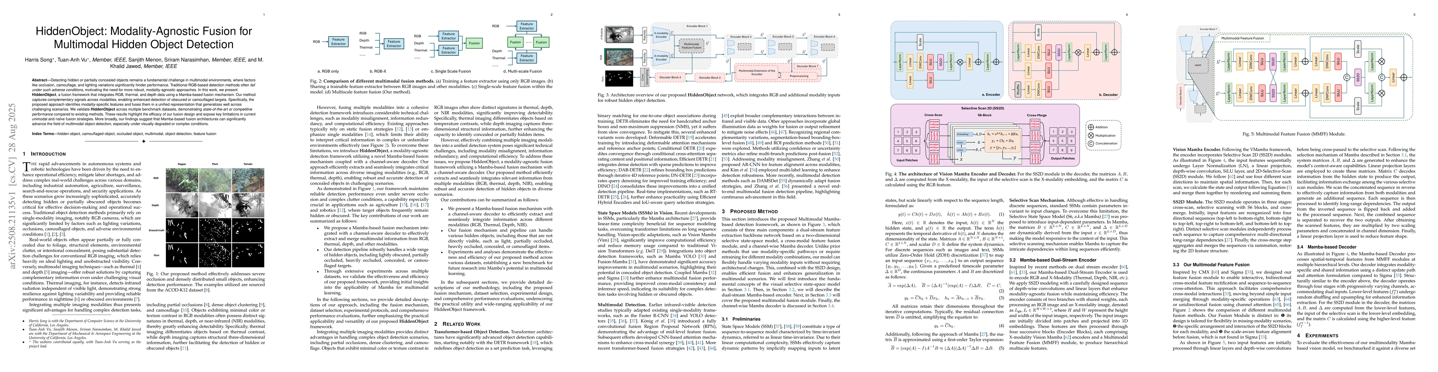 Detecting hidden or partially concealed objects remains a fundamental challenge in multimodal environments, where factors like occlusion, camouflage, and lighting variations significantly hinder performance. Traditional RGB-based detection methods often fail under such adverse conditions, motivating the need for more robust, modality-agnostic approaches. In this work, we present HiddenObject, a fusion framework that integrates RGB, thermal, and depth data using a Mamba-based fusion mechanism. Our method captures complementary signals across modalities, enabling enhanced detection of obscured or camouflaged targets. Specifically, the proposed approach identifies modality-specific features and fuses them in a unified representation that generalizes well across challenging scenarios. We validate HiddenObject across multiple benchmark datasets, demonstrating state-of-the-art or competitive performance compared to existing methods. These results highlight the efficacy of our fusion design and expose key limitations in current unimodal and na\"ive fusion strategies. More broadly, our findings suggest that Mamba-based fusion architectures can significantly advance the field of multimodal object detection, especially under visually degraded or complex conditions.
