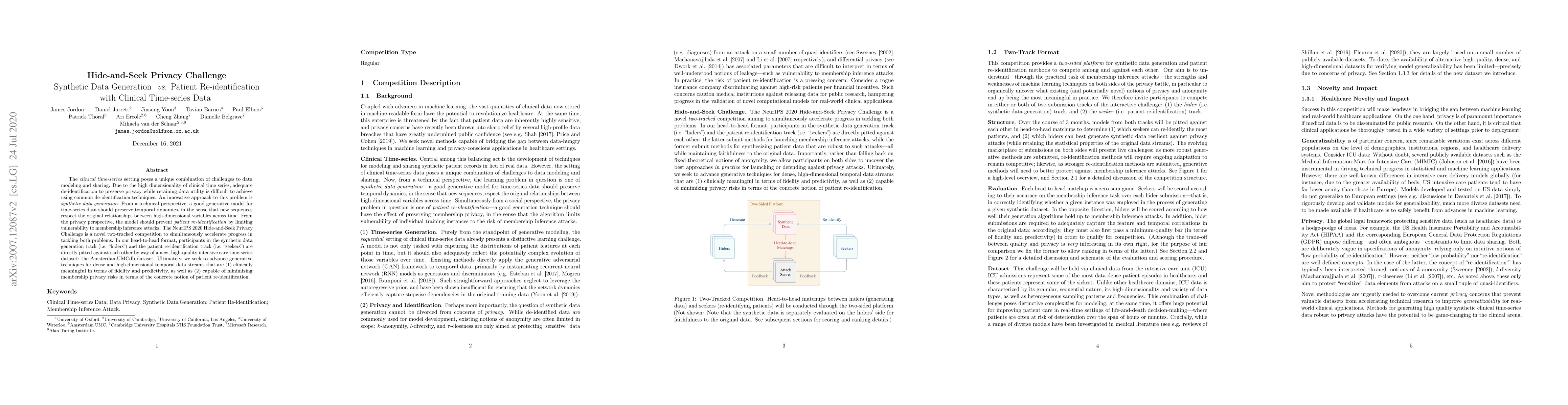 The NeurIPS 2020 Hide-and-Seek Privacy Challenge aims to develop synthetic data generation techniques for high-dimensional clinical time-series data that preserve temporal dynamics and minimize re-identification risks, through a competitive format pitting "hiders" generating synthetic data against "seekers" attempting to re-identify patients.