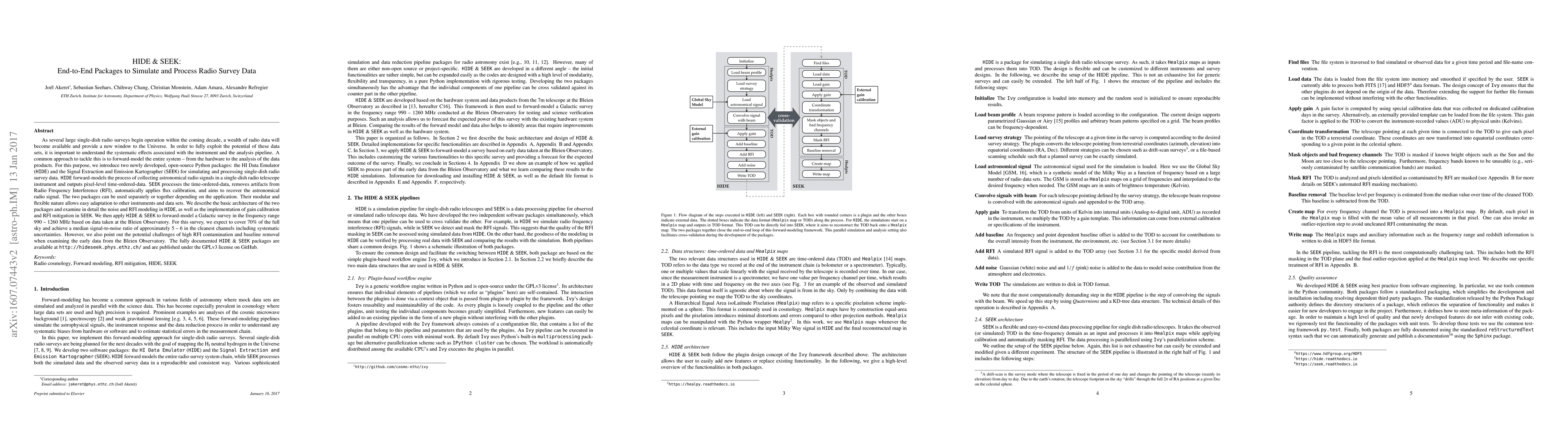 The paper introduces two open-source Python packages, HIDE and SEEK, to simulate and process data from single-dish radio surveys. HIDE models the collection of radio signals, while SEEK processes the data, removes RFI, and applies calibration. The packages are applied to a Galactic survey, highlighting challenges like RFI contamination and baseline removal.