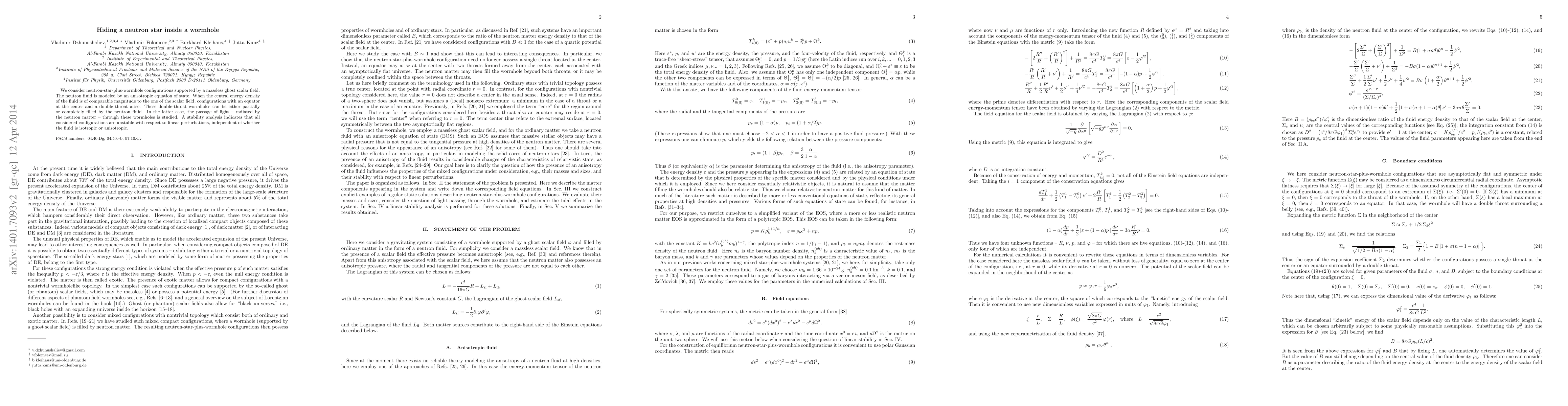 Researchers explored neutron-star-plus-wormhole configurations supported by a ghost scalar field, finding that double-throat wormholes can be filled with neutron fluid, but are unstable to linear perturbations.