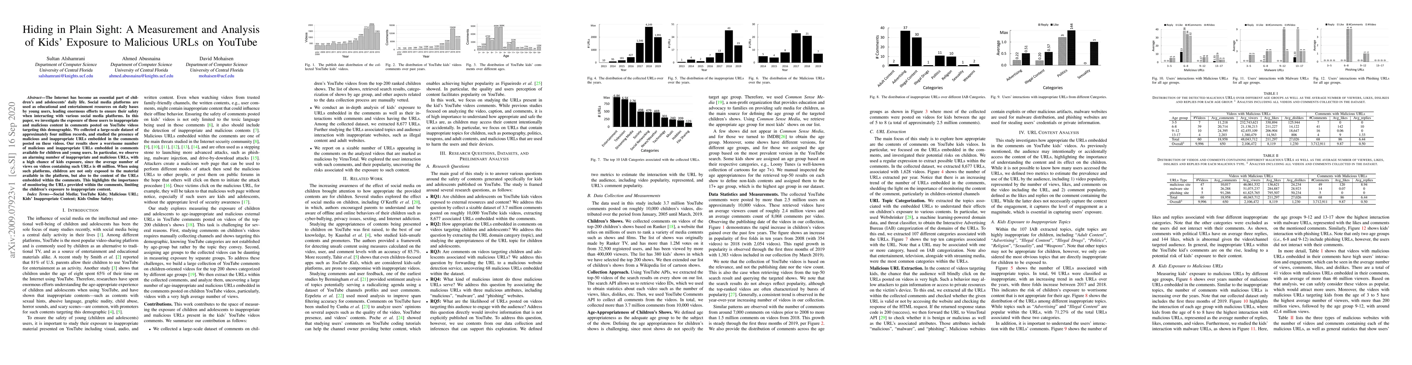 This paper investigates children's exposure to malicious and inappropriate URLs in YouTube comments, revealing a large-scale dataset showing a significant presence of such URLs. The findings highlight the urgent need for monitoring to protect young users from harmful content.