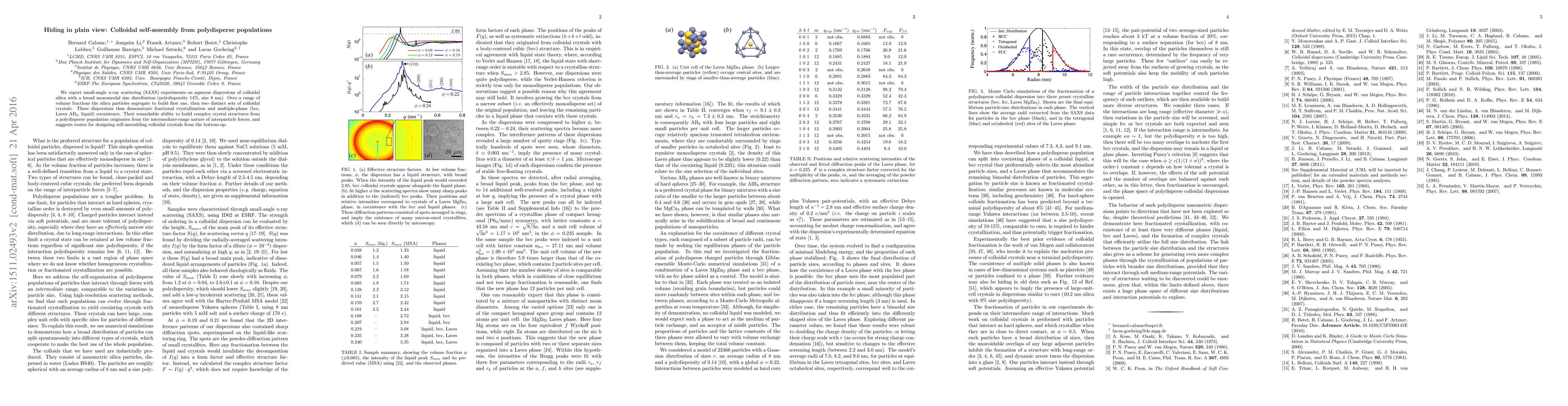 We report small-angle x-ray scattering (SAXS) experiments on aqueous dispersions of colloidal silica with a broad monomodal size distribution (polydispersity 18%, size 8 nm). Over a range of volume fractions the silica particles segregate to build first one, then two distinct sets of colloidal crystals. These dispersions thus demonstrate fractional crystallization and multiple-phase (bcc, Laves AB$_2$, liquid) coexistence. Their remarkable ability to build complex crystal structures from a polydisperse population originates from the intermediate-range nature of interparticle forces, and suggests routes for designing self-assembling colloidal crystals from the bottom-up.