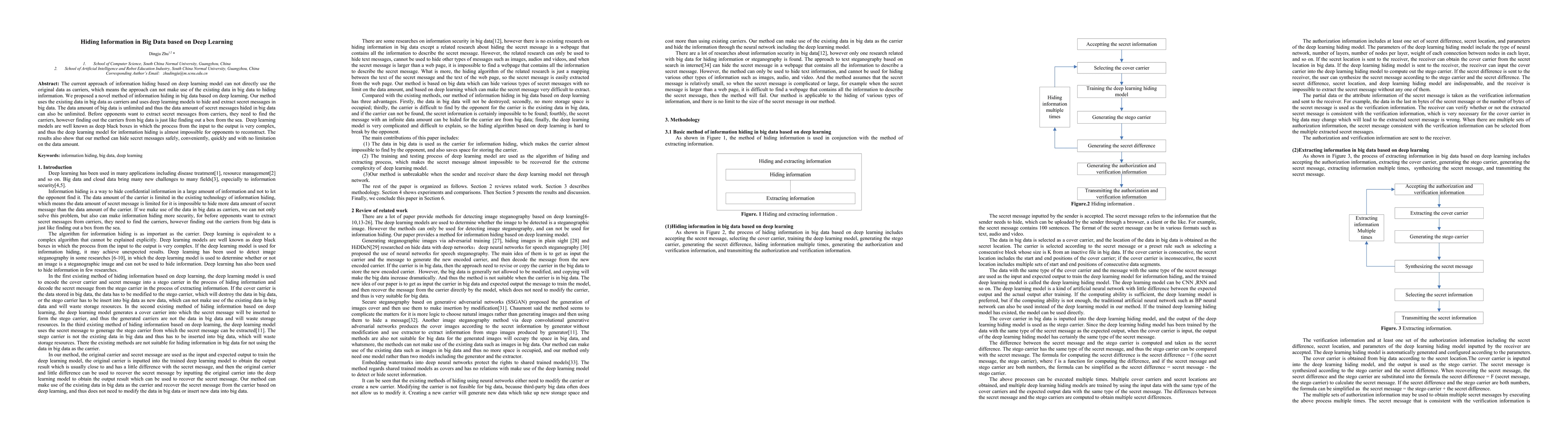 This paper proposes a novel method for hiding information in big data using deep learning, enabling the use of existing big data as carriers. The method leverages the complexity of deep learning models to securely hide and extract secret messages, making it difficult for opponents to detect or reconstruct the hidden information.