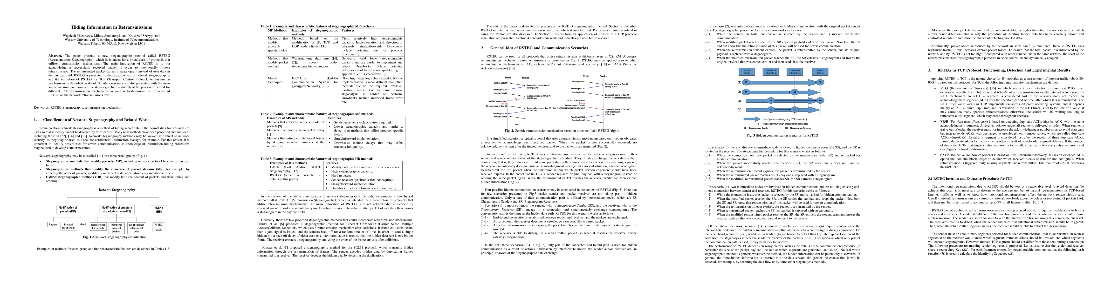 The paper introduces RSTEG, a novel steganographic method that embeds information in retransmission packets by deliberately not acknowledging received packets, thereby triggering retransmissions that carry the hidden steganogram. Simulation results assess RSTEG's bandwidth efficiency and its impact on TCP retransmission mechanisms.