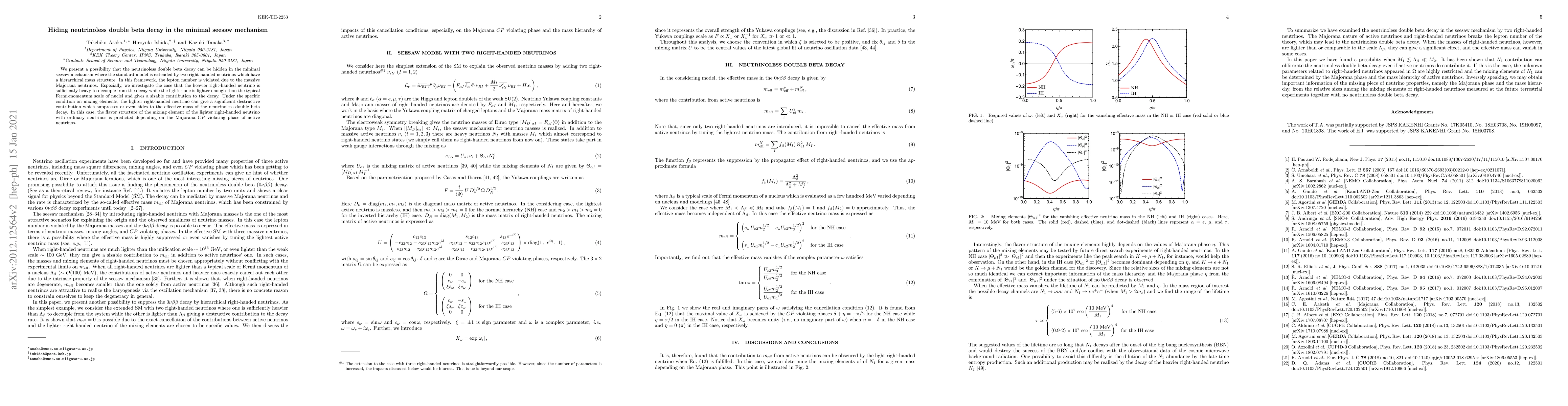 This paper explores how neutrinoless double beta decay might be concealed in the minimal seesaw mechanism, where the standard model is extended by two hierarchical right-handed neutrinos. The study finds that a heavier right-handed neutrino can decouple from the decay, while a lighter one, under specific mixing conditions, can significantly suppress the decay, effectively hiding it.