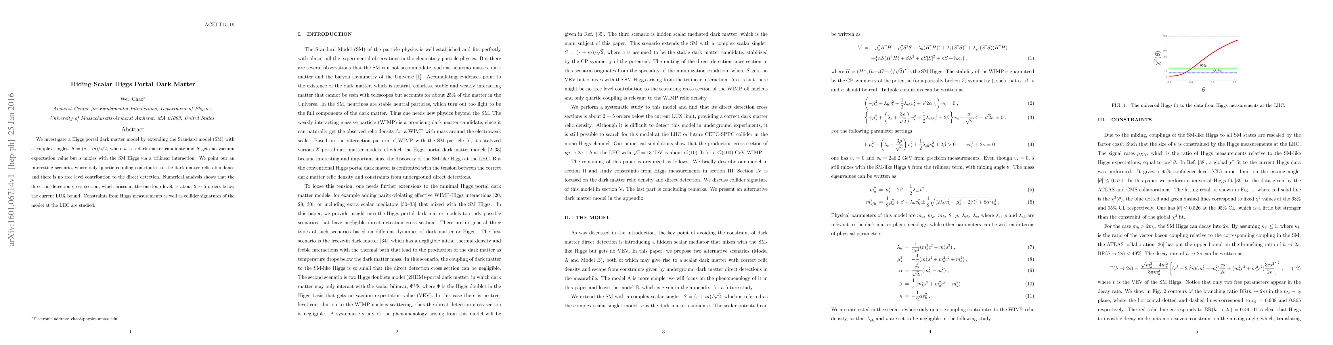 This paper explores a Higgs portal dark matter model featuring a complex scalar singlet that mixes with the SM Higgs, leading to a scenario where only quartic coupling affects relic abundance, and direct detection is suppressed. The model's direct detection cross section is shown to be significantly below current experimental limits, while collider signatures and Higgs measurement constraints are also analyzed.