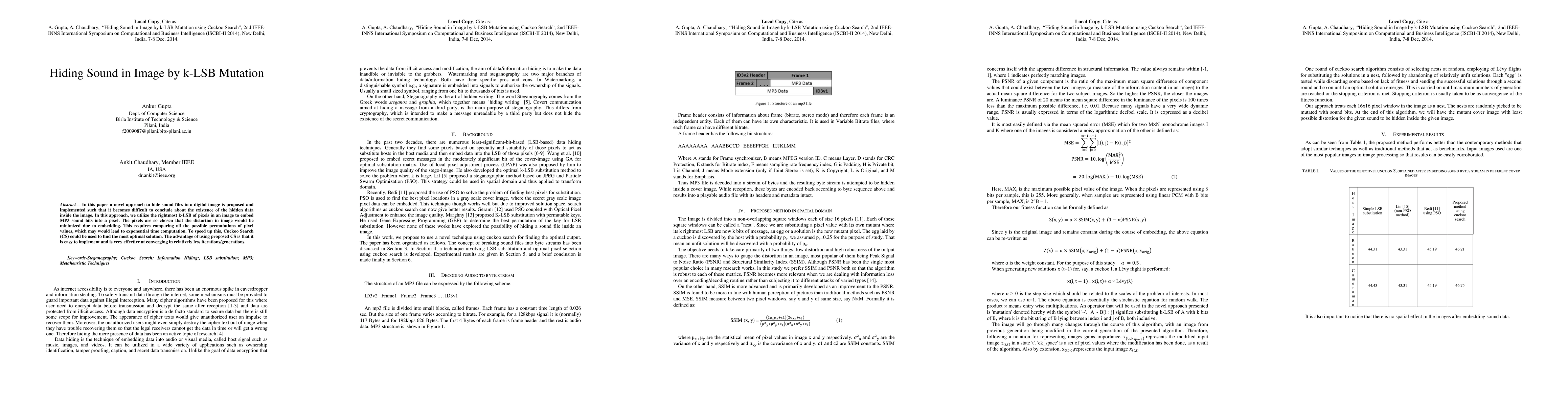 In this paper a novel approach to hide sound files in a digital image is proposed and implemented such that it becomes difficult to conclude about the existence of the hidden data inside the image. In this approach, we utilize the rightmost k-LSB of pixels in an image to embed MP3 sound bits into a pixel. The pixels are so chosen that the distortion in image would be minimized due to embedding. This requires comparing all the possible permutations of pixel values, which may would lead to exponential time computation. To speed up this, Cuckoo Search (CS) could be used to find the most optimal solution. The advantage of using proposed CS is that it is easy to implement and is very effective at converging in relatively less iterations/generations.