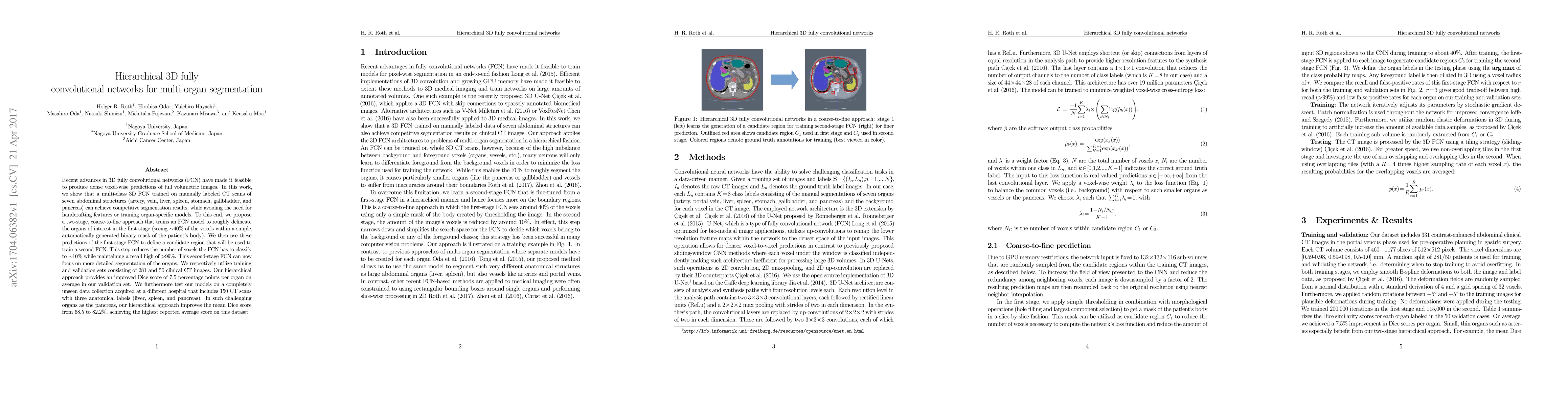 This paper presents a hierarchical 3D fully convolutional network (FCN) for multi-organ segmentation in CT scans, achieving competitive results by avoiding hand-crafted features. The proposed two-stage coarse-to-fine approach significantly improves segmentation accuracy, particularly for challenging organs like the pancreas, with an average Dice score improvement of 7.5 percentage points.