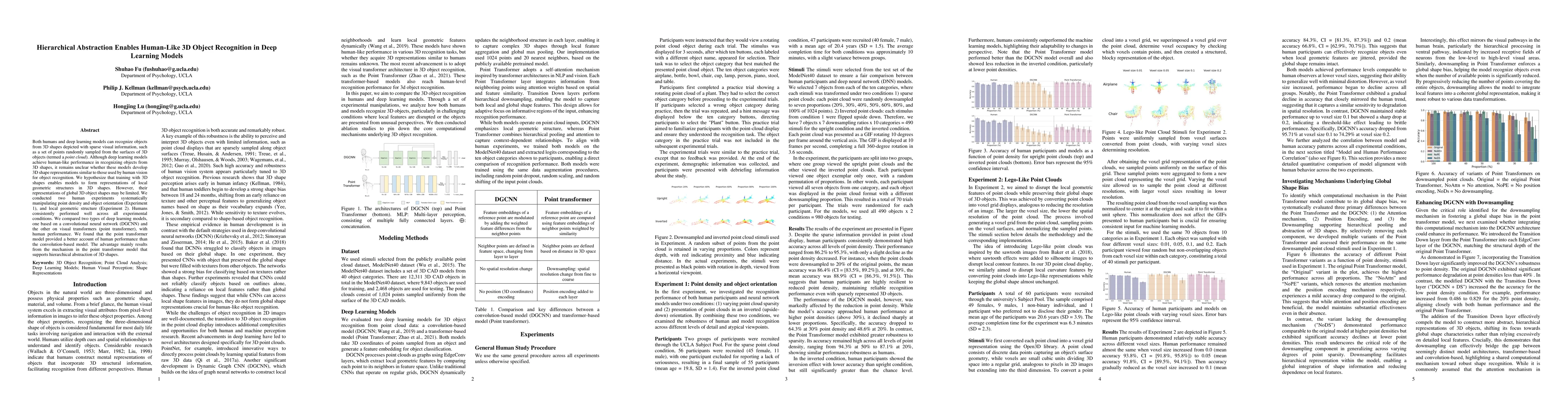 Both humans and deep learning models can recognize objects from 3D shapes depicted with sparse visual information, such as a set of points randomly sampled from the surfaces of 3D objects (termed a point cloud). Although deep learning models achieve human-like performance in recognizing objects from 3D shapes, it remains unclear whether these models develop 3D shape representations similar to those used by human vision for object recognition. We hypothesize that training with 3D shapes enables models to form representations of local geometric structures in 3D shapes. However, their representations of global 3D object shapes may be limited. We conducted two human experiments systematically manipulating point density and object orientation (Experiment 1), and local geometric structure (Experiment 2). Humans consistently performed well across all experimental conditions. We compared two types of deep learning models, one based on a convolutional neural network (DGCNN) and the other on visual transformers (point transformer), with human performance. We found that the point transformer model provided a better account of human performance than the convolution-based model. The advantage mainly results from the mechanism in the point transformer model that supports hierarchical abstraction of 3D shapes.