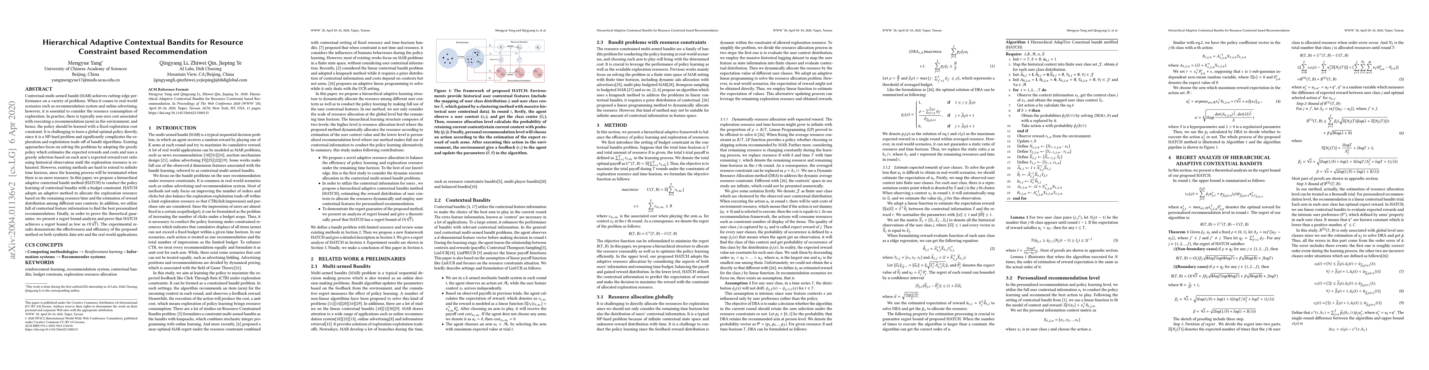 This paper proposes HATCH, a hierarchical adaptive contextual bandit method for recommendation systems under resource constraints. It adaptively allocates exploration resources based on remaining time and reward distribution, leveraging full contextual feature information for personalized recommendations, and achieves a regret bound of $O(\sqrt{T})$. Experimental results show its effectiveness and efficiency on both synthetic and real-world data.