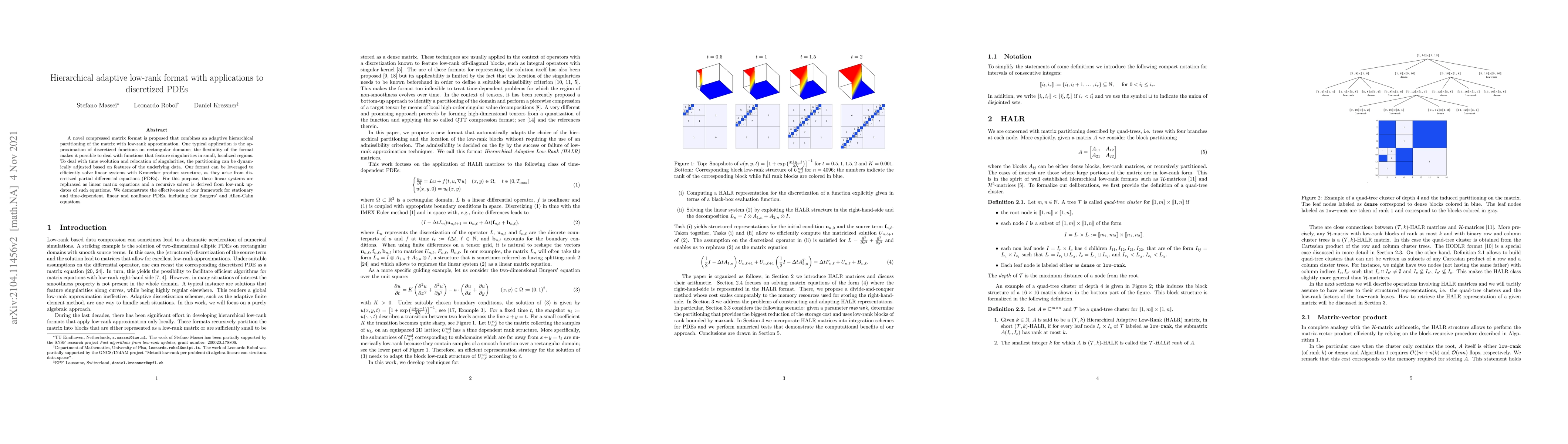 This paper proposes a hierarchical adaptive low-rank matrix format that combines adaptive partitioning with low-rank approximation to efficiently solve discretized PDEs. The format dynamically adjusts to singularities and time evolution, enabling efficient solutions for linear systems arising from PDEs through recursive low-rank updates.