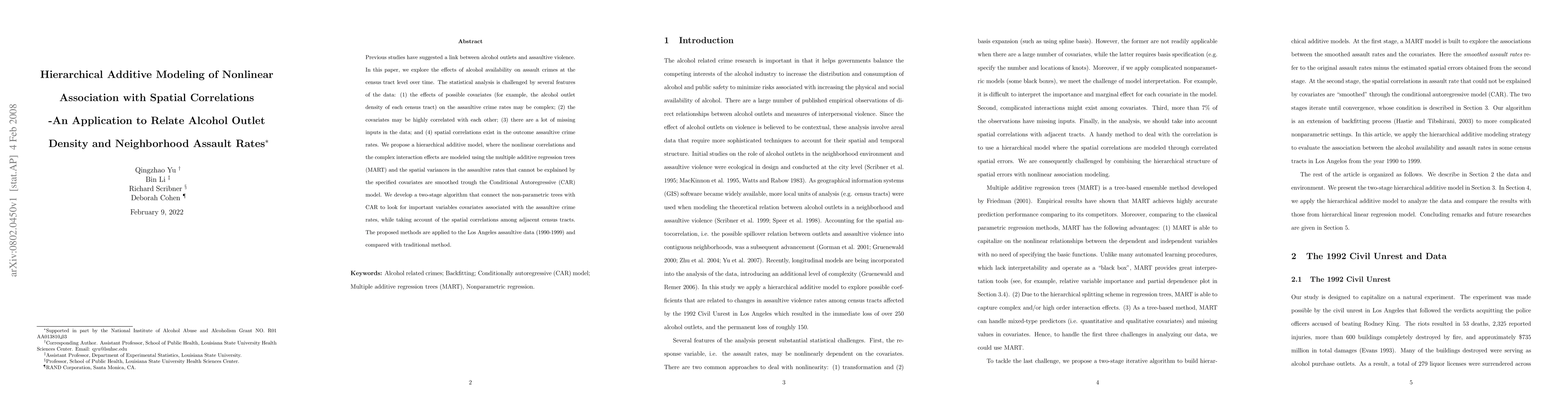 Previous studies have suggested a link between alcohol outlets and assaultive violence. In this paper, we explore the effects of alcohol availability on assault crimes at the census tract level over time. The statistical analysis is challenged by several features of the data: (1) the effects of possible covariates (for example, the alcohol outlet density of each census tract) on the assaultive crime rates may be complex; (2) the covariates may be highly correlated with each other; (3) there are a lot of missing inputs in the data; and (4) spatial correlations exist in the outcome assaultive crime rates. We propose a hierarchical additive model, where the nonlinear correlations and the complex interaction effects are modeled using the multiple additive regression trees (MART) and the spatial variances in the assaultive rates that cannot be explained by the specified covariates are smoothed trough the Conditional Autoregressive (CAR) model. We develop a two-stage algorithm that connect the non-parametric trees with CAR to look for important variables covariates associated with the assaultive crime rates, while taking account of the spatial correlations among adjacent census tracts. The proposed methods are applied to the Los Angeles assaultive data (1990-1999) and compared with traditional method.
