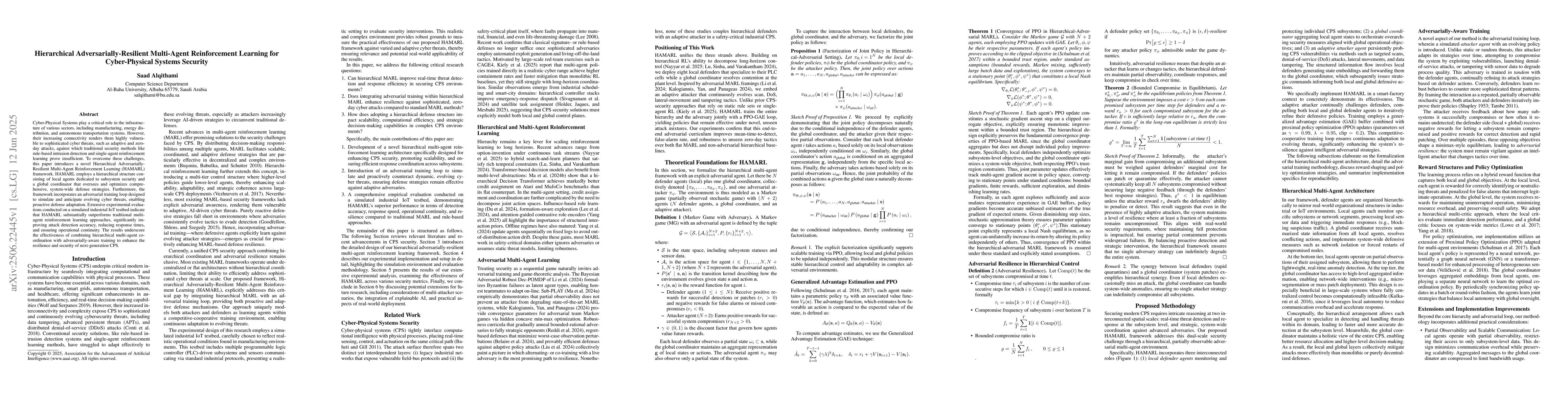 Cyber-Physical Systems play a critical role in the infrastructure of various sectors, including manufacturing, energy distribution, and autonomous transportation systems. However, their increasing connectivity renders them highly vulnerable to sophisticated cyber threats, such as adaptive and zero-day attacks, against which traditional security methods like rule-based intrusion detection and single-agent reinforcement learning prove insufficient. To overcome these challenges, this paper introduces a novel Hierarchical Adversarially-Resilient Multi-Agent Reinforcement Learning (HAMARL) framework. HAMARL employs a hierarchical structure consisting of local agents dedicated to subsystem security and a global coordinator that oversees and optimizes comprehensive, system-wide defense strategies. Furthermore, the framework incorporates an adversarial training loop designed to simulate and anticipate evolving cyber threats, enabling proactive defense adaptation. Extensive experimental evaluations conducted on a simulated industrial IoT testbed indicate that HAMARL substantially outperforms traditional multi-agent reinforcement learning approaches, significantly improving attack detection accuracy, reducing response times, and ensuring operational continuity. The results underscore the effectiveness of combining hierarchical multi-agent coordination with adversarially-aware training to enhance the resilience and security of next-generation CPS.