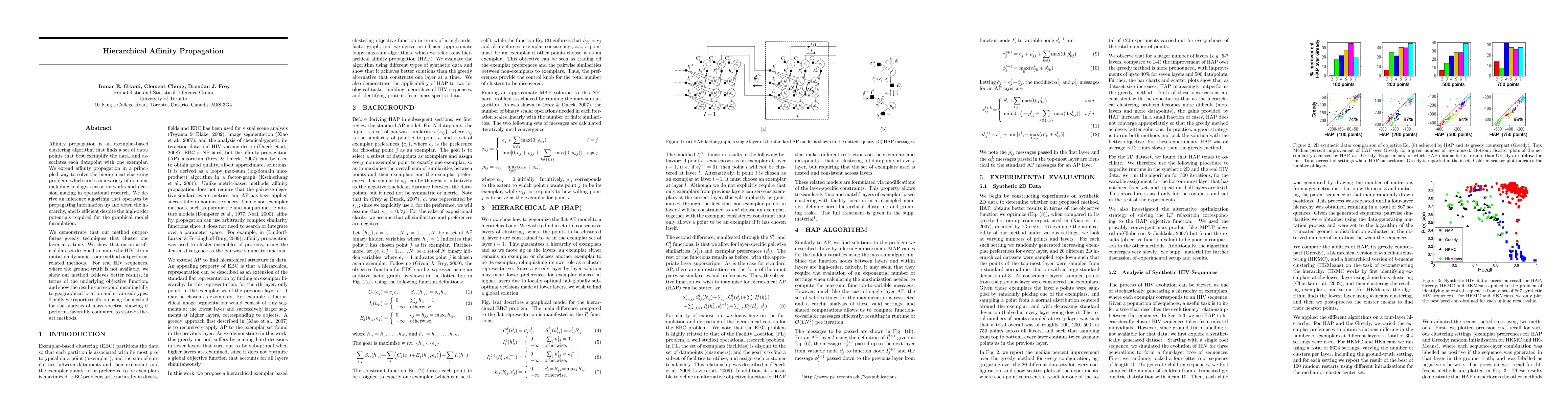 This paper extends affinity propagation to hierarchical clustering, introducing an efficient inference algorithm that outperforms greedy methods. It demonstrates superior performance on artificial datasets and real HIV sequences, showing meaningful alignment with geographical locations and strain subtypes, and favorable results in mass spectra analysis.