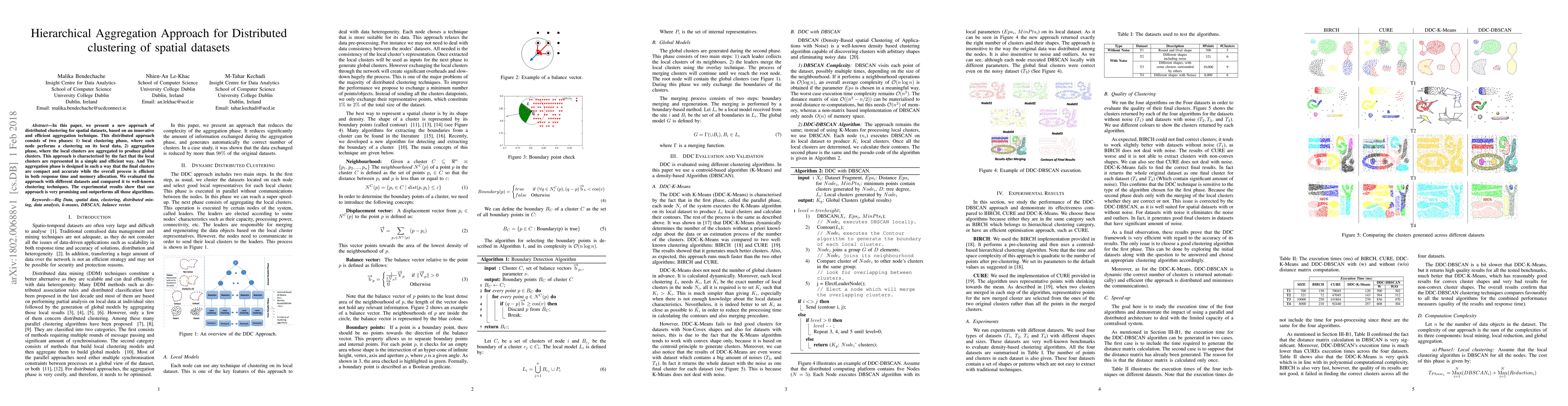 This paper introduces a hierarchical aggregation technique for distributed clustering of spatial datasets, featuring two phases: local clustering and aggregation. The method efficiently represents local clusters and aggregates them to form global clusters, achieving compact and accurate results with optimized response time and memory usage. Experimental results indicate superior performance compared to existing clustering algorithms.