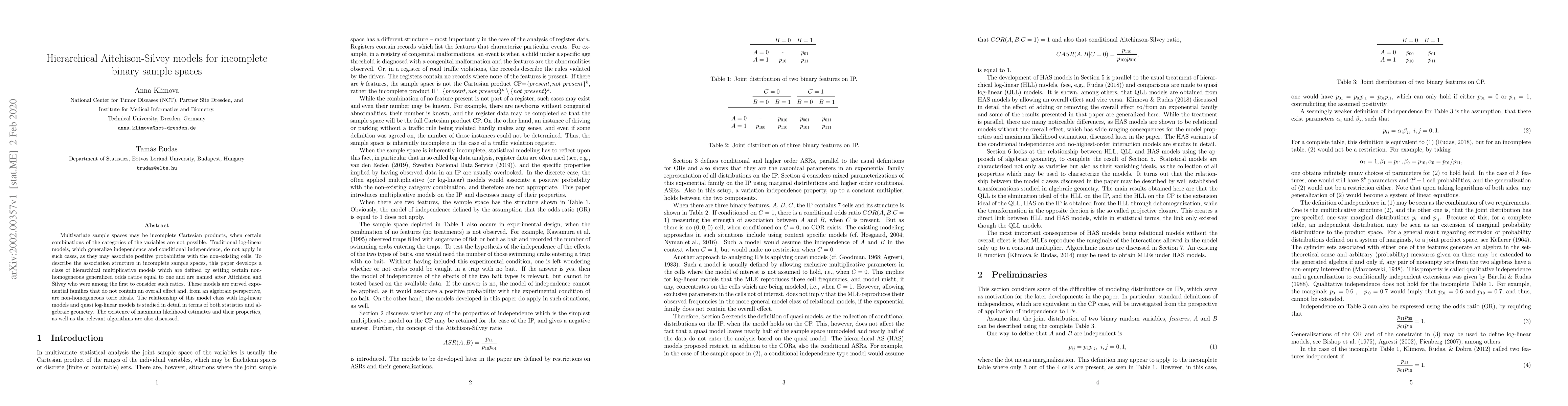 This paper introduces a new class of hierarchical models for incomplete binary sample spaces, which can handle non-existent cell combinations without associating positive probabilities. These models are related to log-linear models and quasi log-linear models, with implications for statistical estimation and analysis.