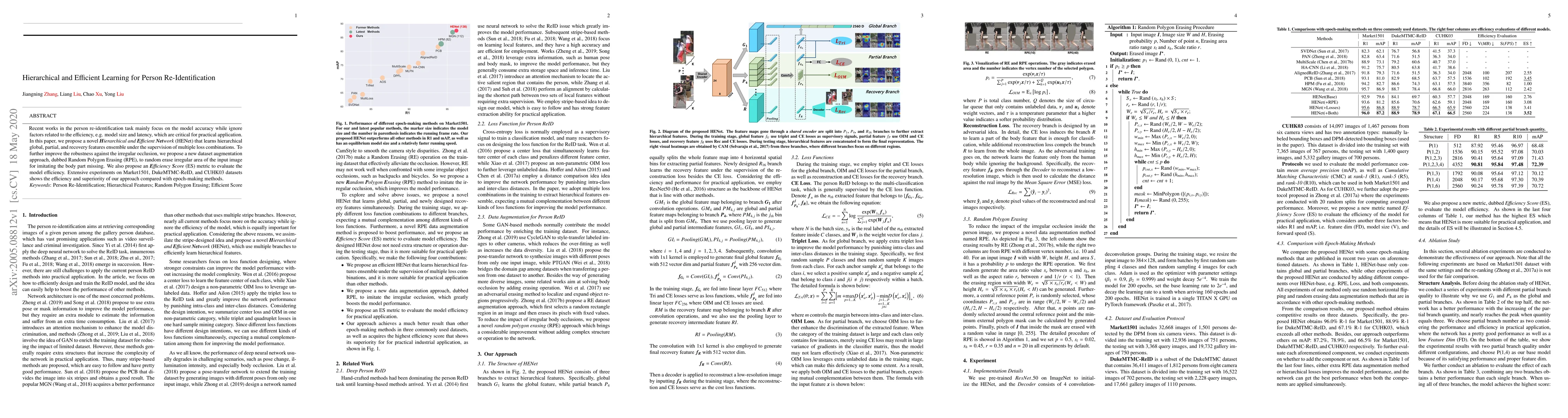 Recent works in the person re-identification task mainly focus on the model accuracy while ignore factors related to the efficiency, e.g. model size and latency, which are critical for practical application. In this paper, we propose a novel Hierarchical and Efficient Network (HENet) that learns hierarchical global, partial, and recovery features ensemble under the supervision of multiple loss combinations. To further improve the robustness against the irregular occlusion, we propose a new dataset augmentation approach, dubbed Random Polygon Erasing (RPE), to random erase irregular area of the input image for imitating the body part missing. We also propose an Efficiency Score (ES) metric to evaluate the model efficiency. Extensive experiments on Market1501, DukeMTMC-ReID, and CUHK03 datasets shows the efficiency and superiority of our approach compared with epoch-making methods.