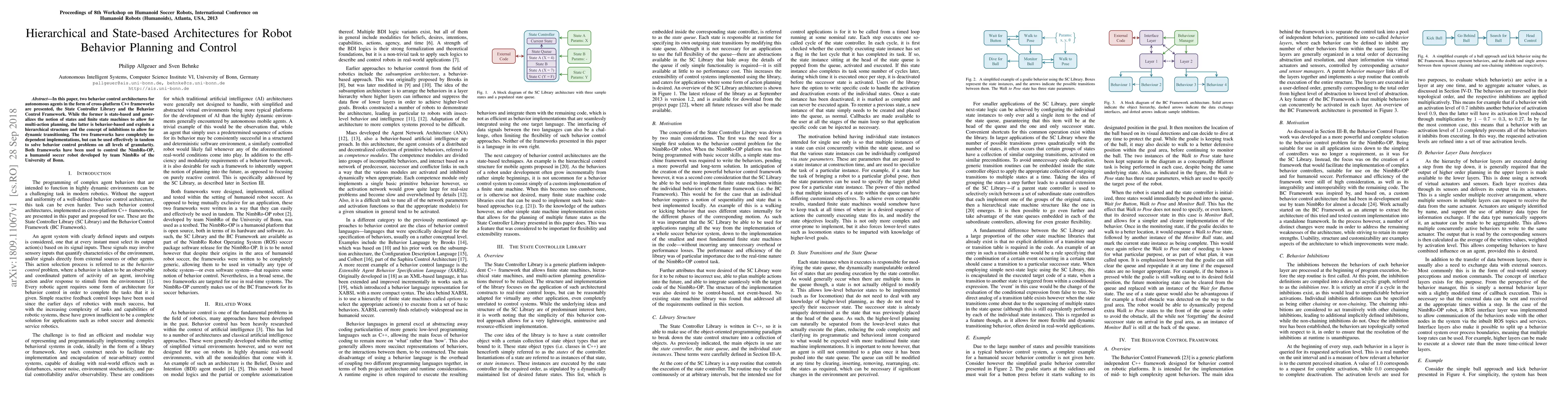 Two behavior control architectures for robots are presented, one state-based and the other behavior-based, both designed to plan and control autonomous agent behavior in various levels of granularity.