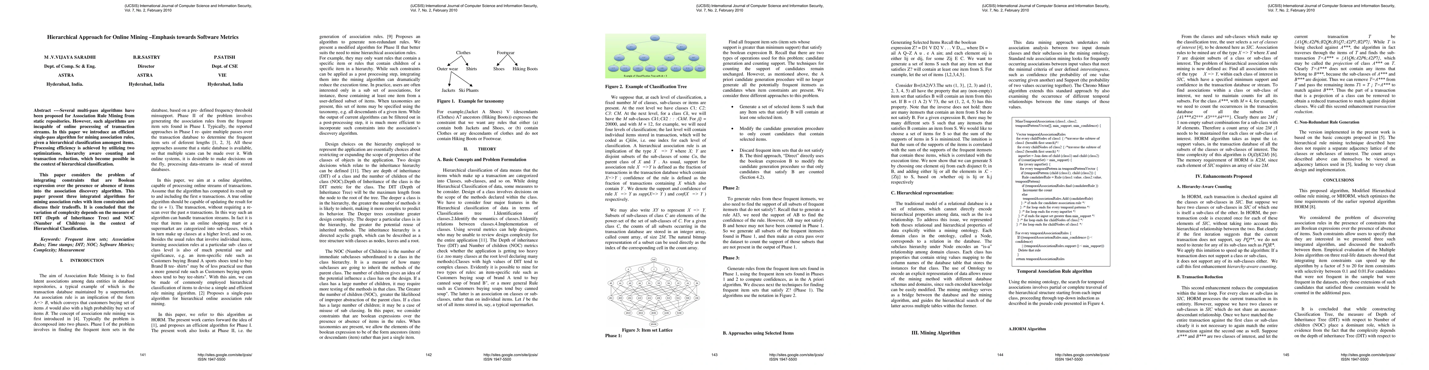 Several multi-pass algorithms have been proposed for Association Rule Mining from static repositories. However, such algorithms are incapable of online processing of transaction streams. In this paper we introduce an efficient single-pass algorithm for mining association rules, given a hierarchical classification amongest items. Processing efficiency is achieved by utilizing two optimizations, hierarchy aware counting and transaction reduction, which become possible in the context of hierarchical classification. This paper considers the problem of integrating constraints that are Boolean expression over the presence or absence of items into the association discovery algorithm. This paper present three integrated algorithms for mining association rules with item constraints and discuss their tradeoffs. It is concluded that the variation of complexity depends on the measure of DIT (Depth of Inheritance Tree) and NOC (Number of Children) in the context of Hierarchical Classification.
