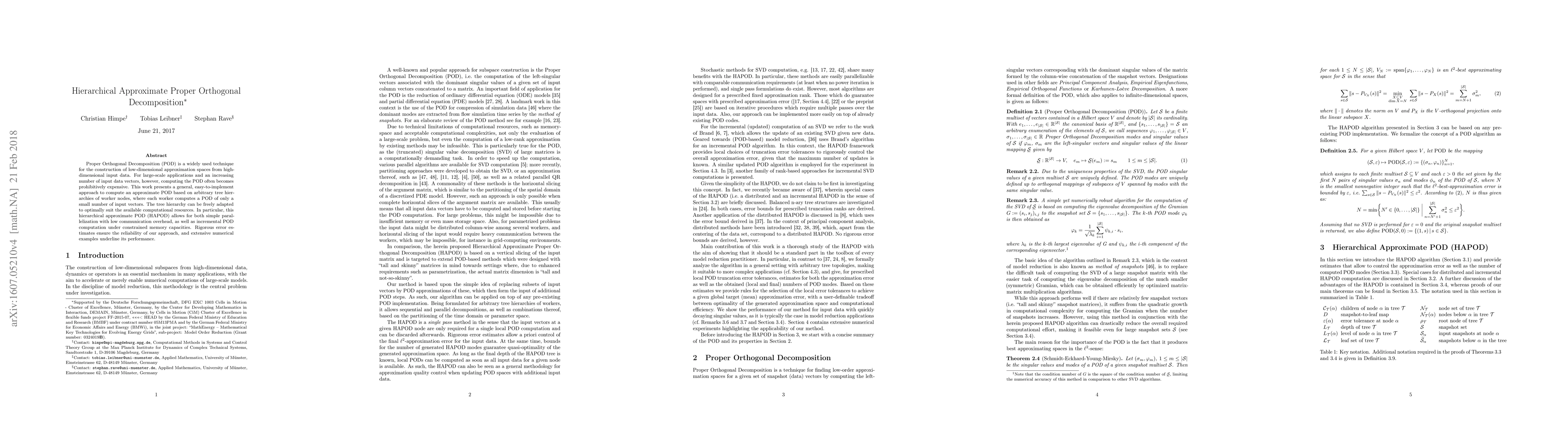This paper introduces Hierarchical Approximate Proper Orthogonal Decomposition (HAPOD), a method to compute an approximate POD using tree hierarchies of worker nodes, enabling efficient parallelization and computation under memory constraints.