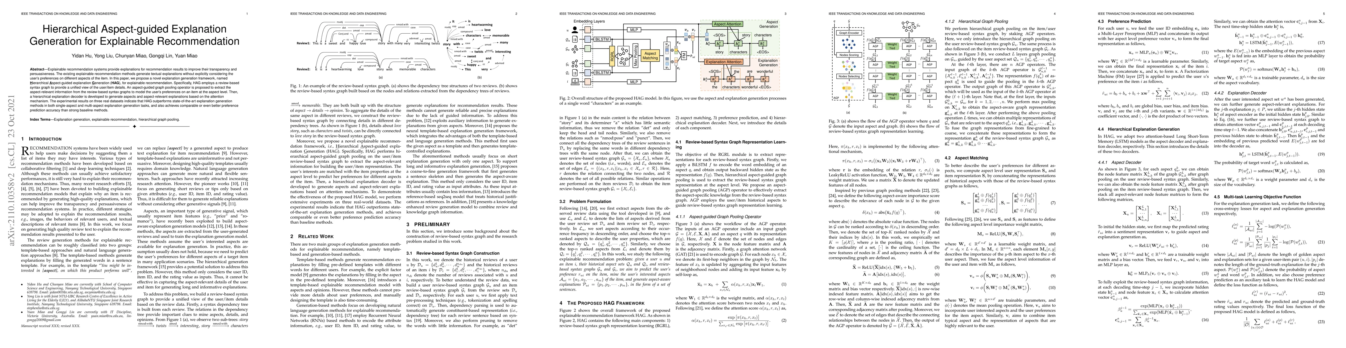 This paper introduces a Hierarchical Aspect-guided explanation Generation (HAG) framework for explainable recommendation systems. HAG uses a review-based syntax graph and an aspect-guided graph pooling operator to model user preferences at the aspect level, followed by a hierarchical explanation decoder, achieving superior performance in generating explanations compared to existing methods.