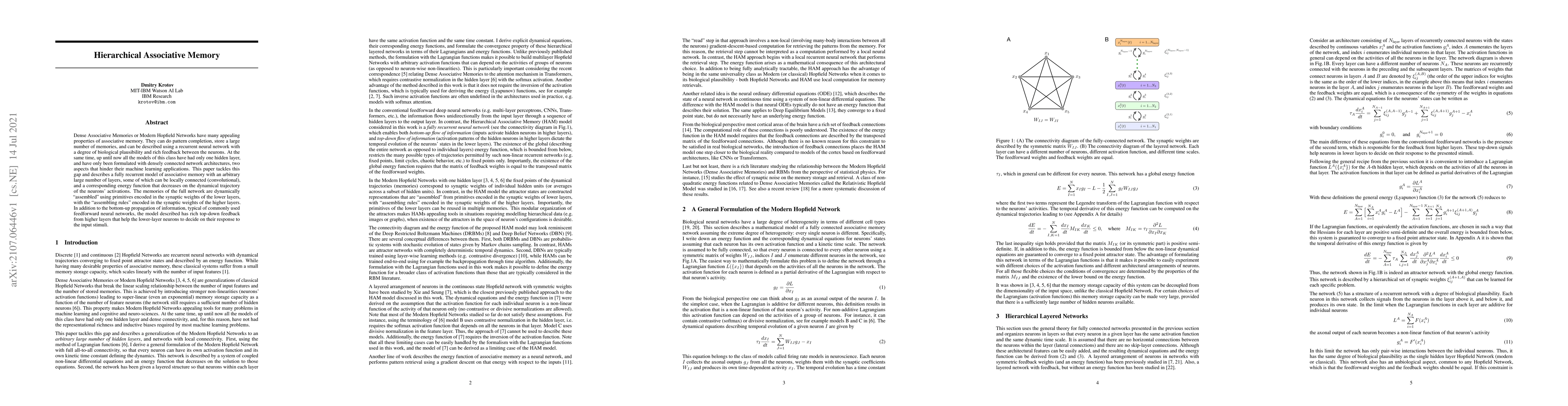 The paper proposes a hierarchical associative memory (HAM) model, a recurrent neural network with an arbitrary number of layers, some of which can be locally connected (convolutional), and a corresponding energy function that decreases along the dynamical trajectory of neurons' activations.