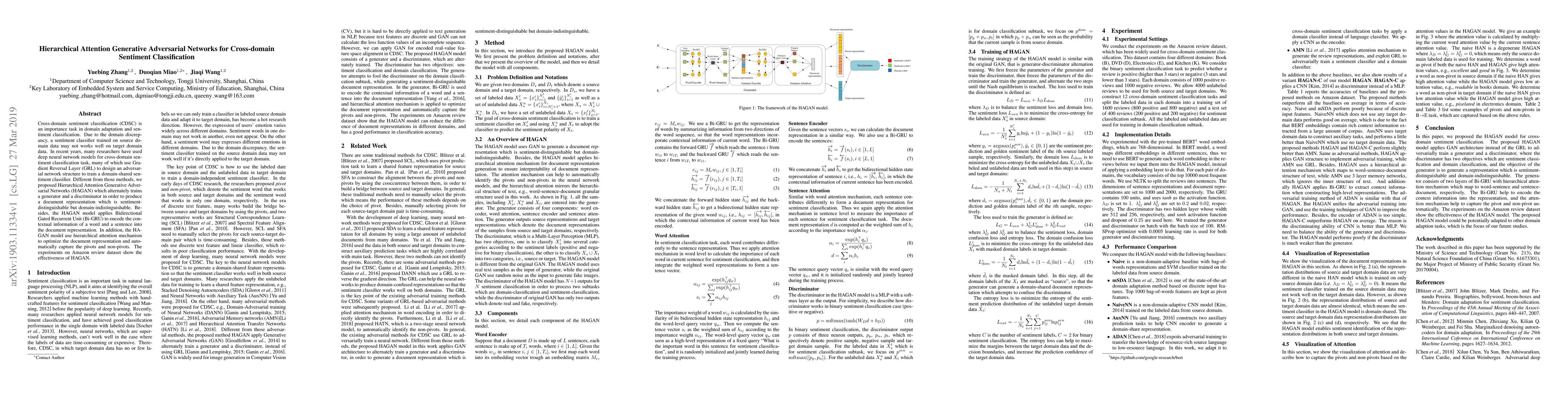 This paper proposes Hierarchical Attention Generative Adversarial Networks (HAGAN) for cross-domain sentiment classification, using a GAN structure with Bi-GRU and hierarchical attention to generate domain-invariant document representations and improve classification performance. Experiments on Amazon review data demonstrate the effectiveness of the proposed method.