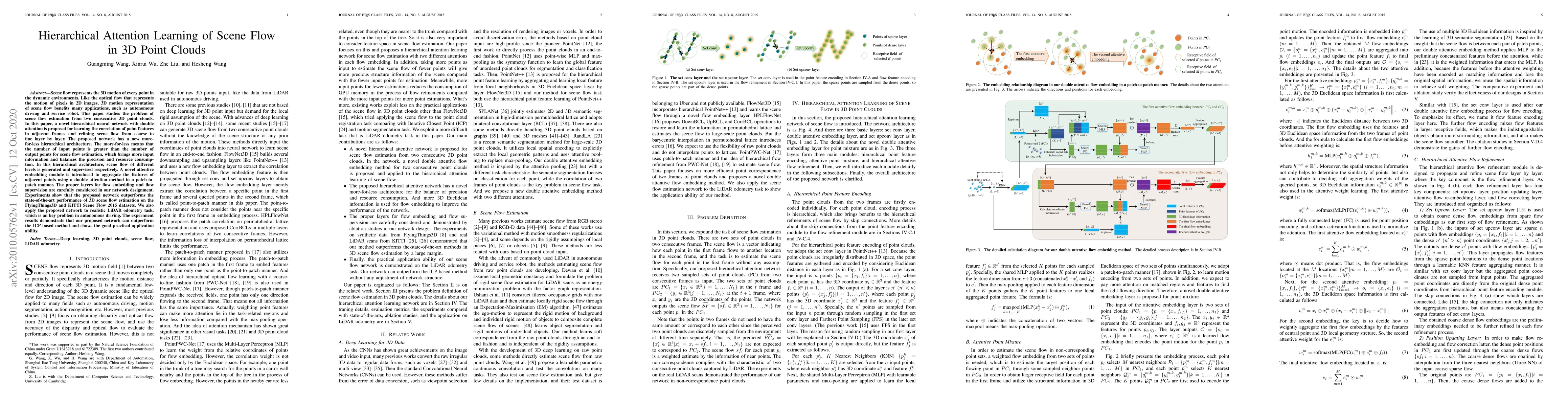 This paper proposes a hierarchical attention learning network with double attention for estimating 3D scene flow from consecutive point clouds, achieving state-of-the-art performance on benchmark datasets and demonstrating practical application in LiDAR odometry for autonomous driving.