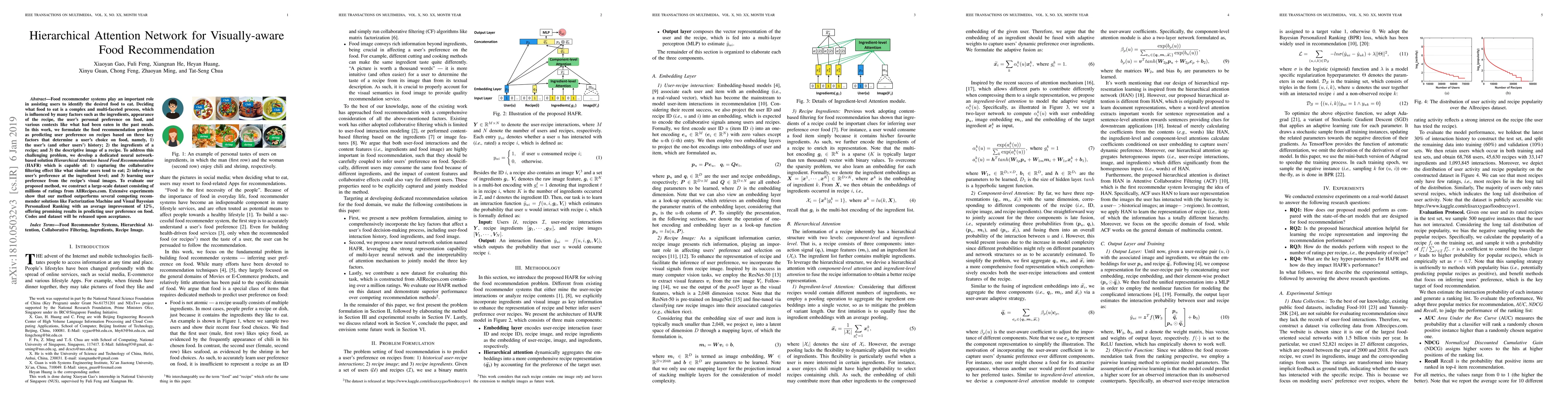 This paper proposes a Hierarchical Attention Network (HAFR) for food recommendation, which integrates user history, recipe ingredients, and visual images to predict user preferences. The method outperforms competing solutions, achieving an average improvement of 12% in accuracy.