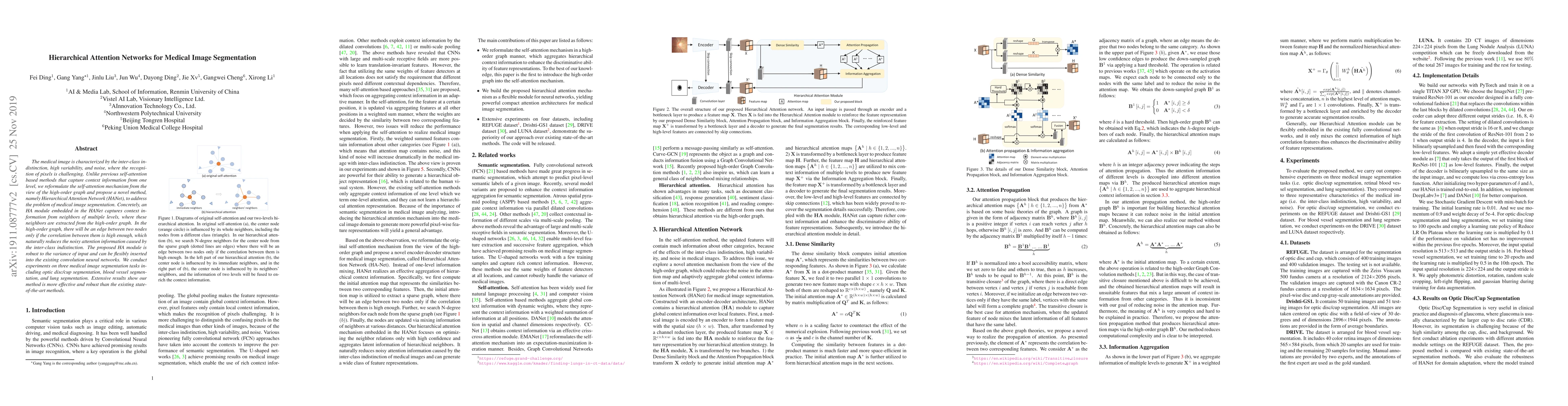 The paper proposes a Hierarchical Attention Network (HANet) for medical image segmentation, utilizing a novel Hierarchical Attention (HA) module that captures context from multiple levels in a high-order graph to reduce noise and improve robustness. Experimental results demonstrate HANet's superior performance over existing methods in tasks like optic disc/cup, blood vessel, and lung segmentation.