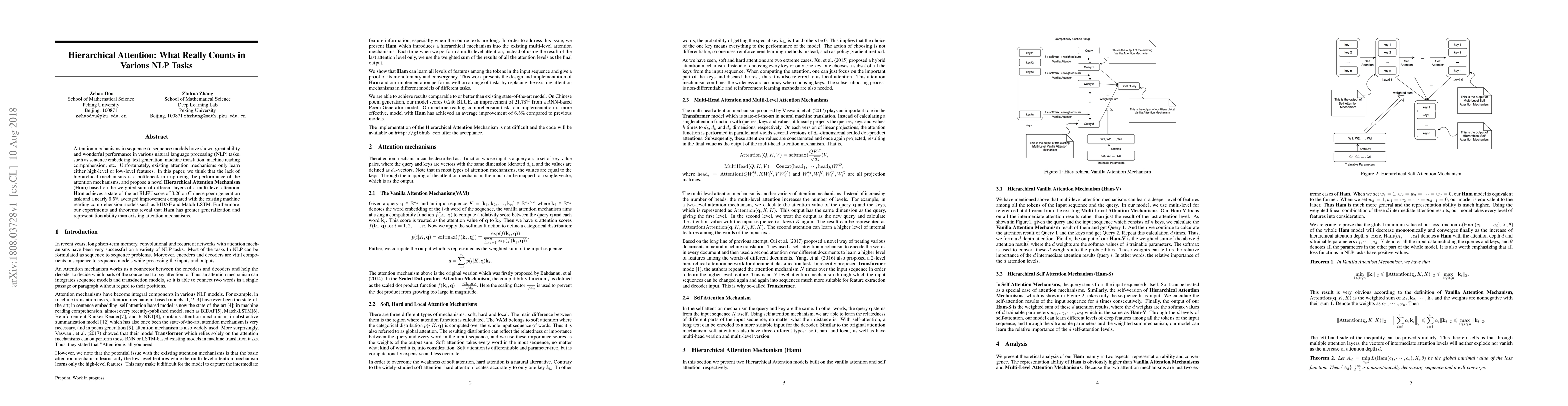 This paper proposes a novel Hierarchical Attention Mechanism (HAM) that integrates multi-level attention to address the limitations of existing attention mechanisms. HAM demonstrates superior performance in various NLP tasks, achieving state-of-the-art results in Chinese poem generation and significant improvements in machine reading comprehension.
