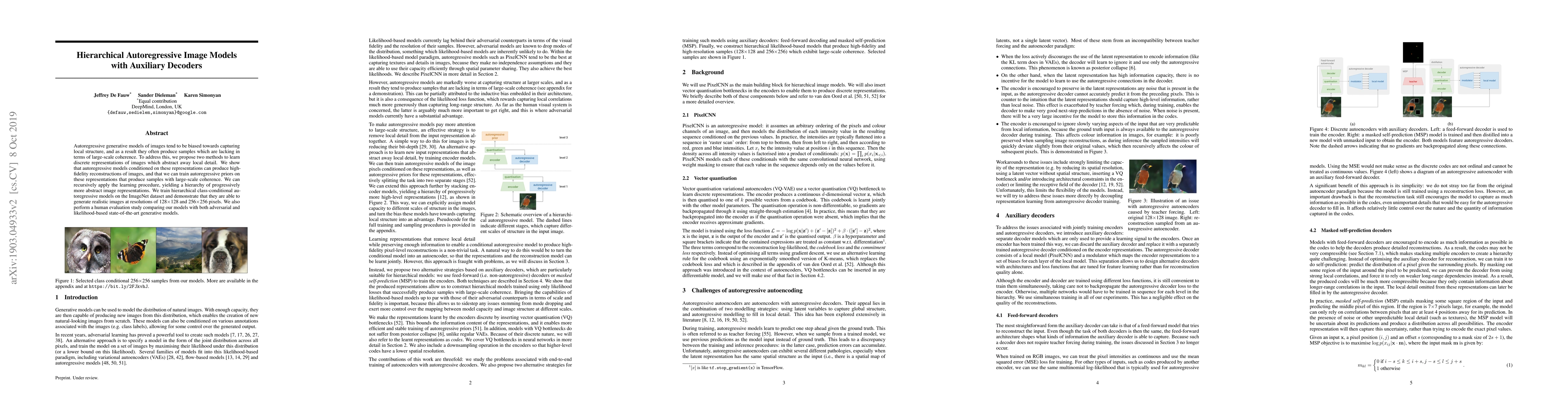 This paper proposes hierarchical autoregressive image models with auxiliary decoders to improve large-scale coherence in generated images by learning discrete representations that abstract away local details. The models trained on ImageNet generate realistic images at resolutions up to 256×256 pixels, outperforming adversarial and likelihood-based generative models in human evaluation studies.