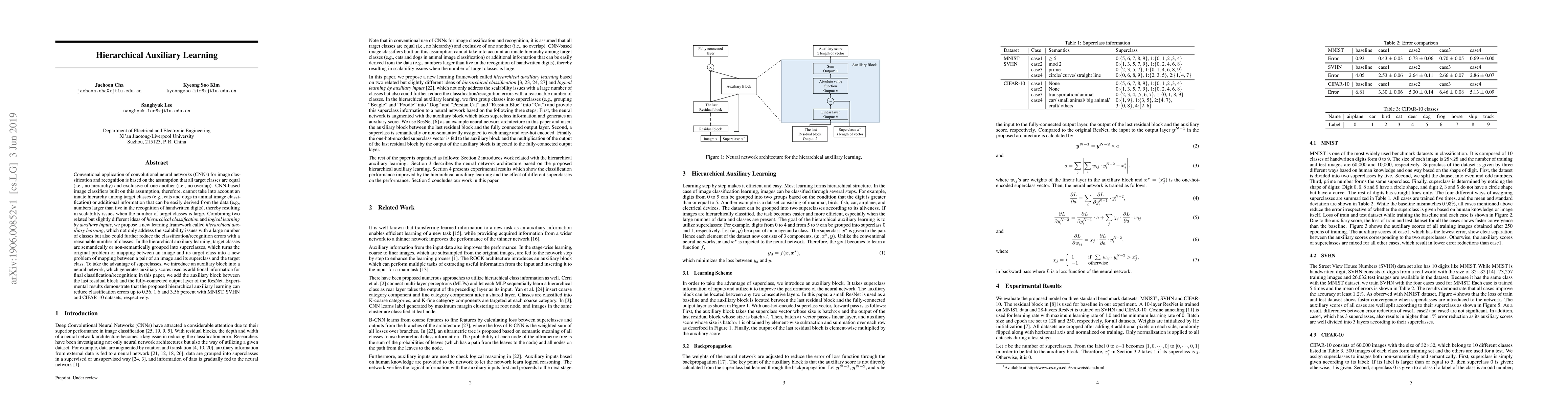The paper proposes a hierarchical auxiliary learning framework to address scalability issues in CNN-based image classification with large numbers of classes. By grouping classes into superclasses and using an auxiliary block to generate additional information, the method reduces classification errors across various datasets.