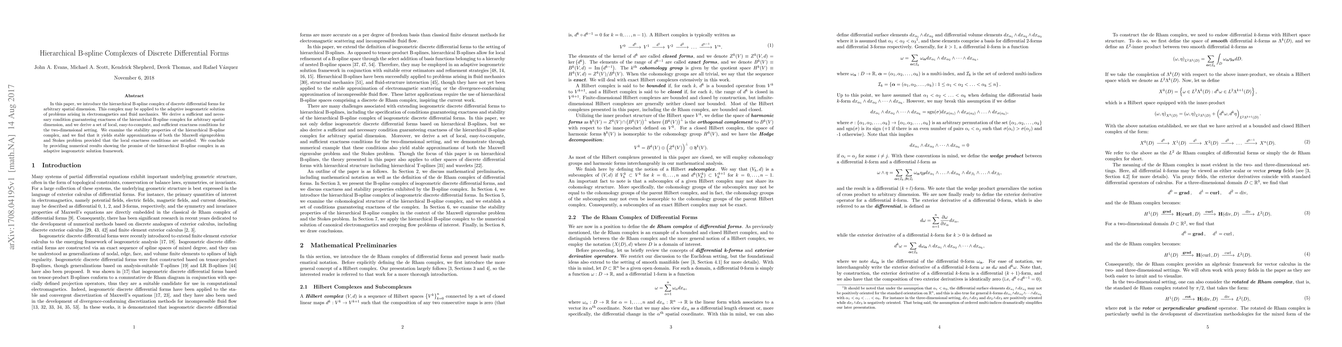 This paper introduces a hierarchical B-spline complex for discrete differential forms in arbitrary dimensions, ensuring exactness and stability for electromagnetic and fluid mechanics problems. Numerical results demonstrate its effectiveness in adaptive isogeometric solution frameworks.