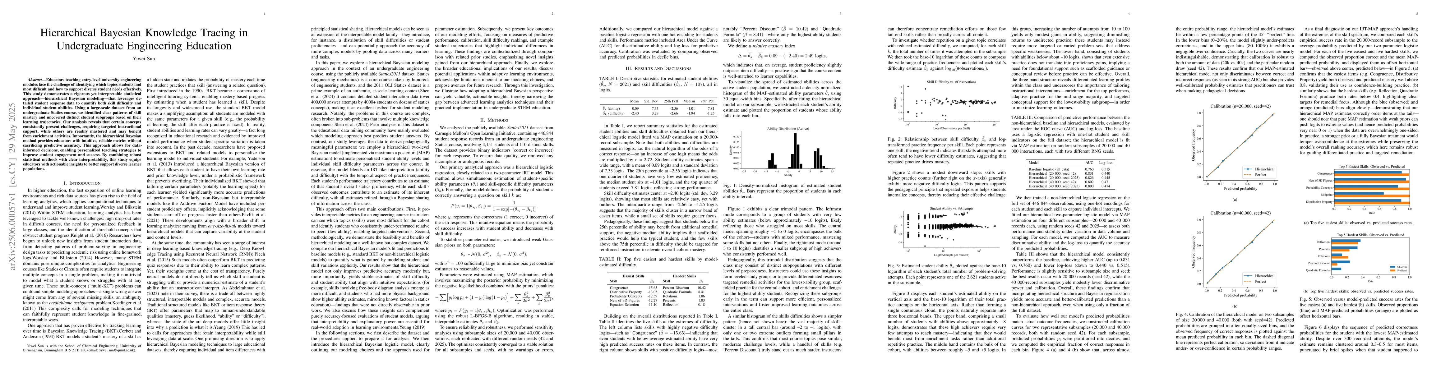 Educators teaching entry-level university engineering modules face the challenge of identifying which topics students find most difficult and how to support diverse student needs effectively. This study demonstrates a rigorous yet interpretable statistical approach -- hierarchical Bayesian modeling -- that leverages detailed student response data to quantify both skill difficulty and individual student abilities. Using a large-scale dataset from an undergraduate Statics course, we identified clear patterns of skill mastery and uncovered distinct student subgroups based on their learning trajectories. Our analysis reveals that certain concepts consistently present challenges, requiring targeted instructional support, while others are readily mastered and may benefit from enrichment activities. Importantly, the hierarchical Bayesian method provides educators with intuitive, reliable metrics without sacrificing predictive accuracy. This approach allows for data-informed decisions, enabling personalized teaching strategies to improve student engagement and success. By combining robust statistical methods with clear interpretability, this study equips educators with actionable insights to better support diverse learner populations.