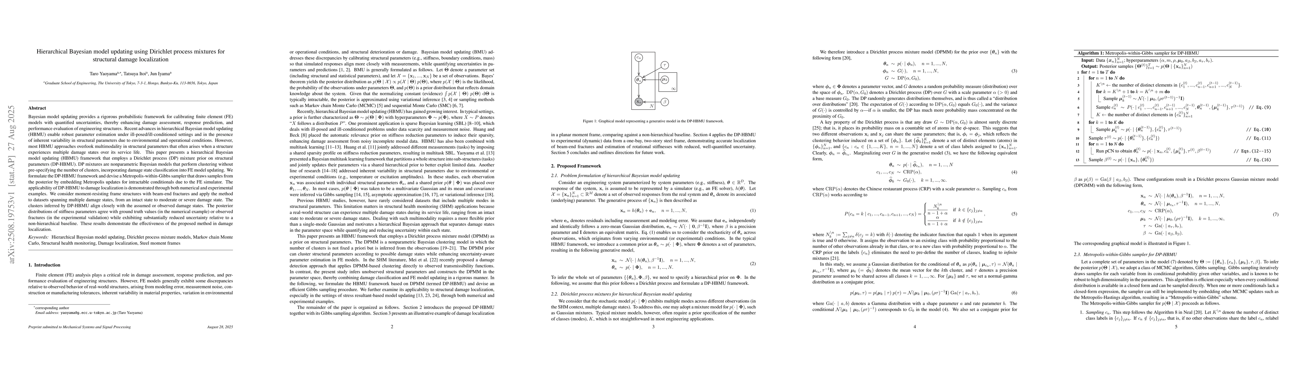 Bayesian model updating provides a rigorous probabilistic framework for calibrating finite element (FE) models with quantified uncertainties, thereby enhancing damage assessment, response prediction, and performance evaluation of engineering structures. Recent advances in hierarchical Bayesian model updating (HBMU) enable robust parameter estimation under ill-posed/ill-conditioned settings and in the presence of inherent variability in structural parameters due to environmental and operational conditions. However, most HBMU approaches overlook multimodality in structural parameters that often arises when a structure experiences multiple damage states over its service life. This paper presents an HBMU framework that employs a Dirichlet process (DP) mixture prior on structural parameters (DP-HBMU). DP mixtures are nonparametric Bayesian models that perform clustering without pre-specifying the number of clusters, incorporating damage state classification into FE model updating. We formulate the DP-HBMU framework and devise a Metropolis-within-Gibbs sampler that draws samples from the posterior by embedding Metropolis updates for intractable conditionals due to the FE simulator. The applicability of DP-HBMU to damage localization is demonstrated through both numerical and experimental examples. We consider moment-resisting frame structures with beam-end fractures and apply the method to datasets spanning multiple damage states, from an intact state to moderate or severe damage state. The clusters inferred by DP-HBMU align closely with the assumed or observed damage states. The posterior distributions of stiffness parameters agree with ground truth values or observed fractures while exhibiting substantially reduced uncertainty relative to a non-hierarchical baseline. These results demonstrate the effectiveness of the proposed method in damage localization.