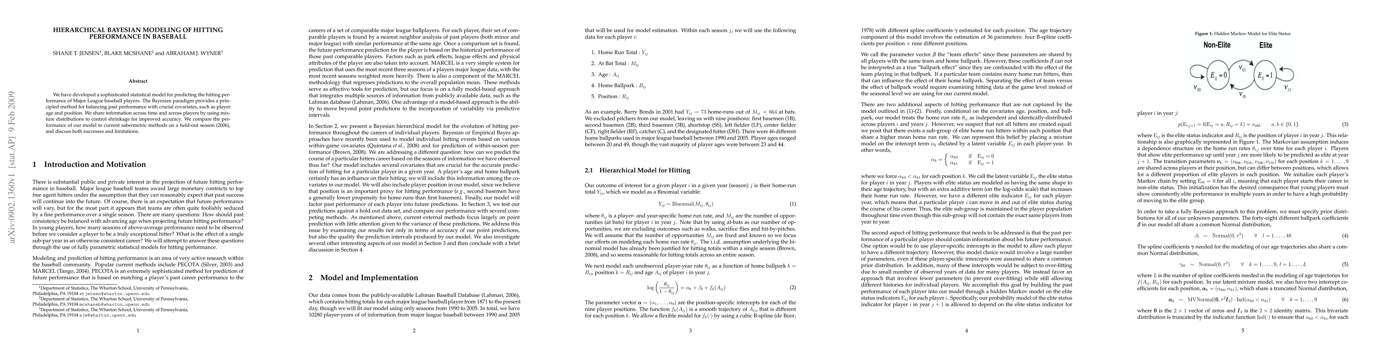 This paper introduces a hierarchical Bayesian model for predicting Major League Baseball players' hitting performance, balancing past performance with covariates like age and position. The model uses mixture distributions for shrinkage, and outperforms current sabermetric methods based on a 2006 season test, though it also highlights some limitations.