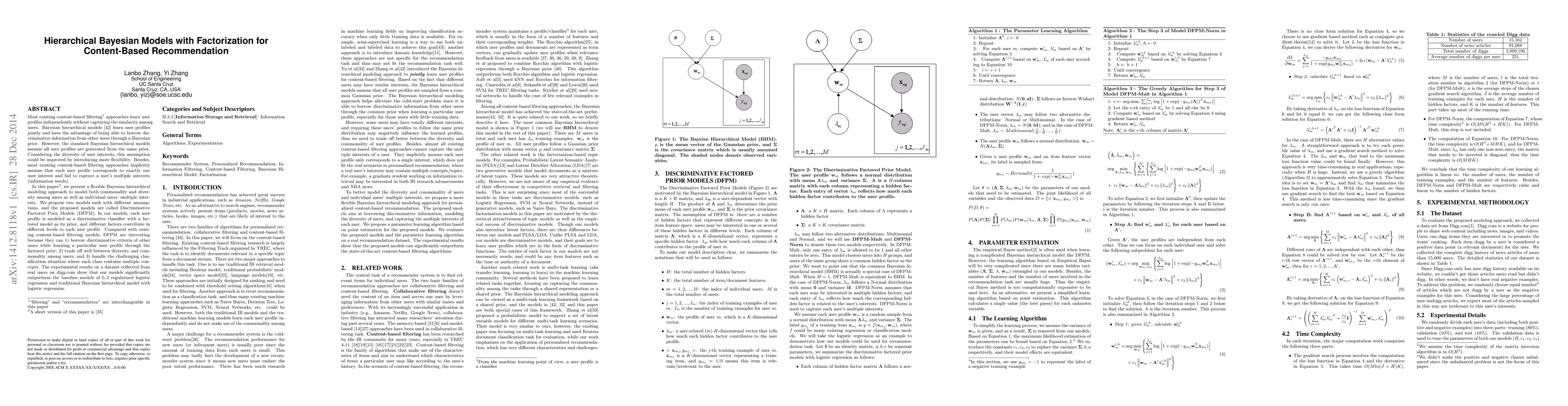 Most existing content-based filtering approaches learn user profiles independently without capturing the similarity among users. Bayesian hierarchical models \cite{Zhang:Efficient} learn user profiles jointly and have the advantage of being able to borrow discriminative information from other users through a Bayesian prior. However, the standard Bayesian hierarchical models assume all user profiles are generated from the same prior. Considering the diversity of user interests, this assumption could be improved by introducing more flexibility. Besides, most existing content-based filtering approaches implicitly assume that each user profile corresponds to exactly one user interest and fail to capture a user's multiple interests (information needs). In this paper, we present a flexible Bayesian hierarchical modeling approach to model both commonality and diversity among users as well as individual users' multiple interests. We propose two models each with different assumptions, and the proposed models are called Discriminative Factored Prior Models (DFPM). In our models, each user profile is modeled as a discriminative classifier with a factored model as its prior, and different factors contribute in different levels to each user profile. Compared with existing content-based filtering models, DFPM are interesting because they can 1) borrow discriminative criteria of other users while learning a particular user profile through the factored prior; 2) trade off well between diversity and commonality among users; and 3) handle the challenging classification situation where each class contains multiple concepts. The experimental results on a dataset collected from real users on digg.com show that our models significantly outperform the baseline models of L-2 regularized logistic regression and traditional Bayesian hierarchical model with logistic regression.