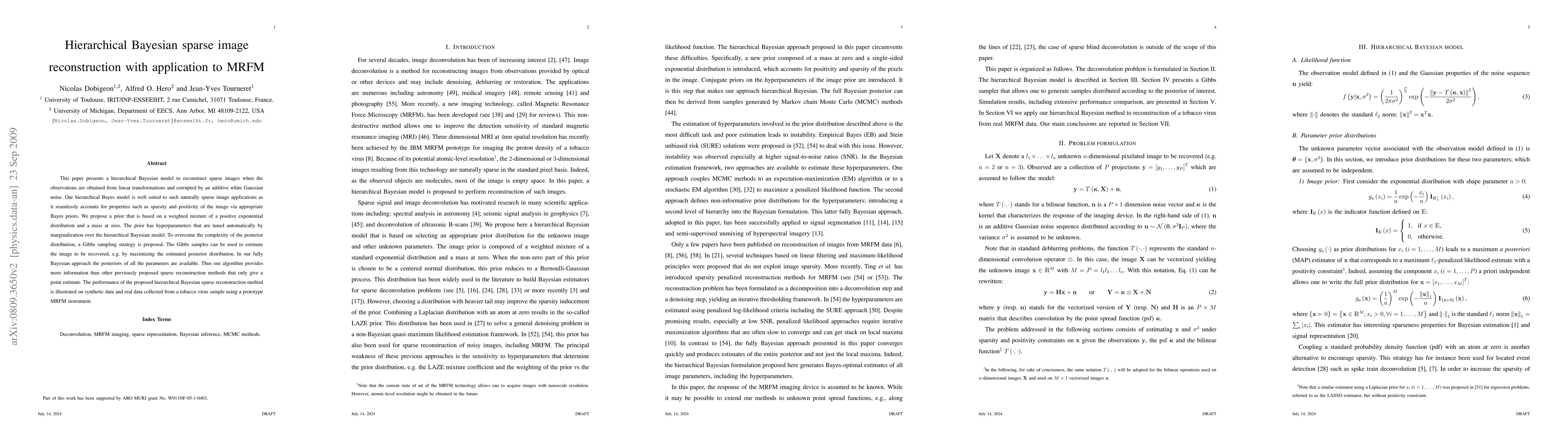 This paper introduces a hierarchical Bayesian model for reconstructing sparse images, employing a Gibbs sampling strategy to handle the posterior distribution complexity. The method provides full posterior distributions for parameters, offering more information than traditional sparse reconstruction techniques, demonstrated through MRFM data.
