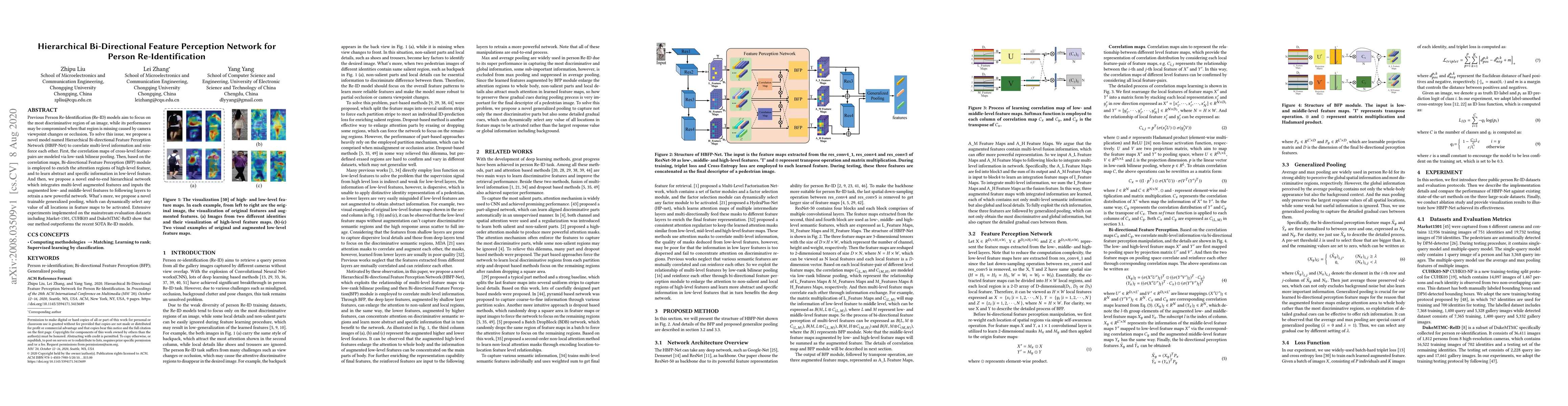 The paper proposes a Hierarchical Bi-directional Feature Perception Network (HBFP-Net) to enhance Person Re-Identification (Re-ID) by leveraging multi-level feature correlations and dynamic pooling, achieving superior performance over recent state-of-the-art models on standard datasets.