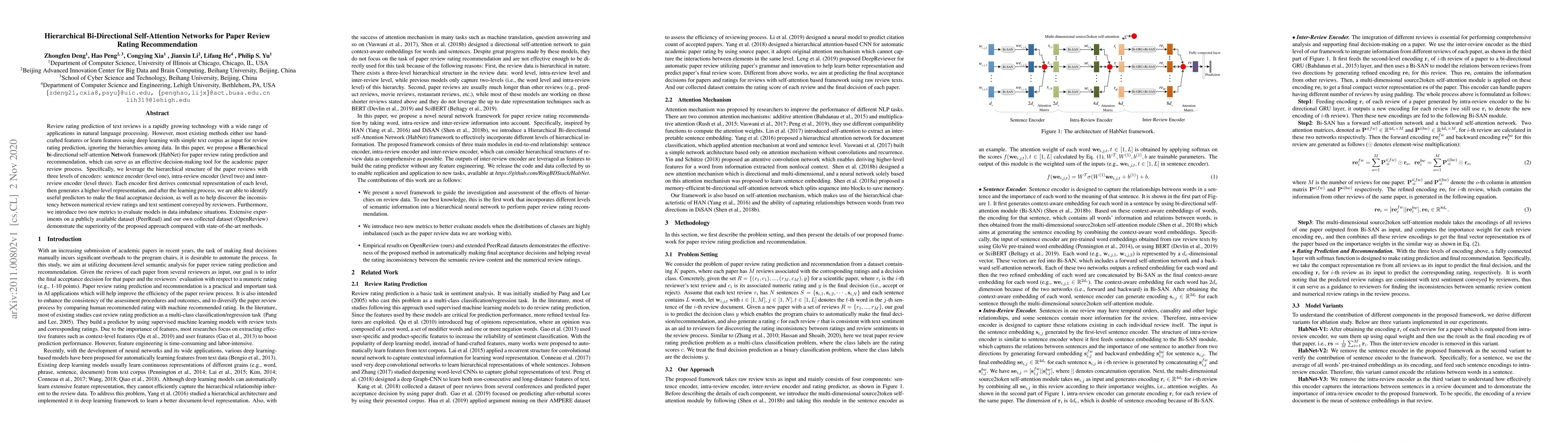 This paper proposes a Hierarchical bi-directional self-attention Network (HabNet) for predicting paper review ratings, leveraging hierarchical structures at three encoder levels to derive contextual representations. The method outperforms existing approaches and introduces new metrics for evaluating models in imbalanced datasets.