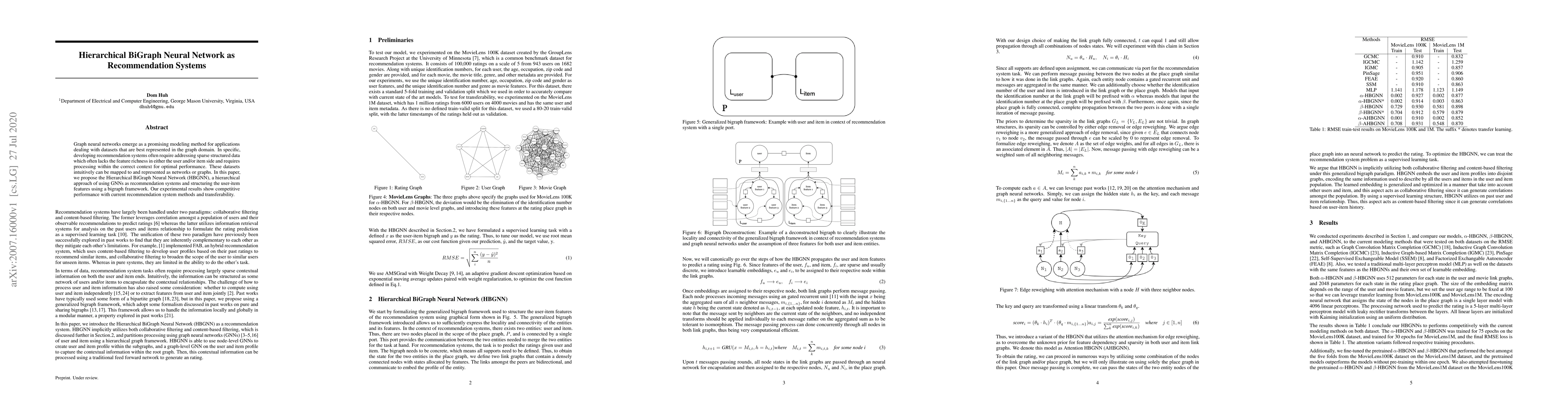 This paper proposes the Hierarchical BiGraph Neural Network (HBGNN) for recommendation systems, leveraging graph neural networks to handle sparse structured data. The approach uses a bigraph framework to structure user-item features, demonstrating competitive performance and transferability in experiments.