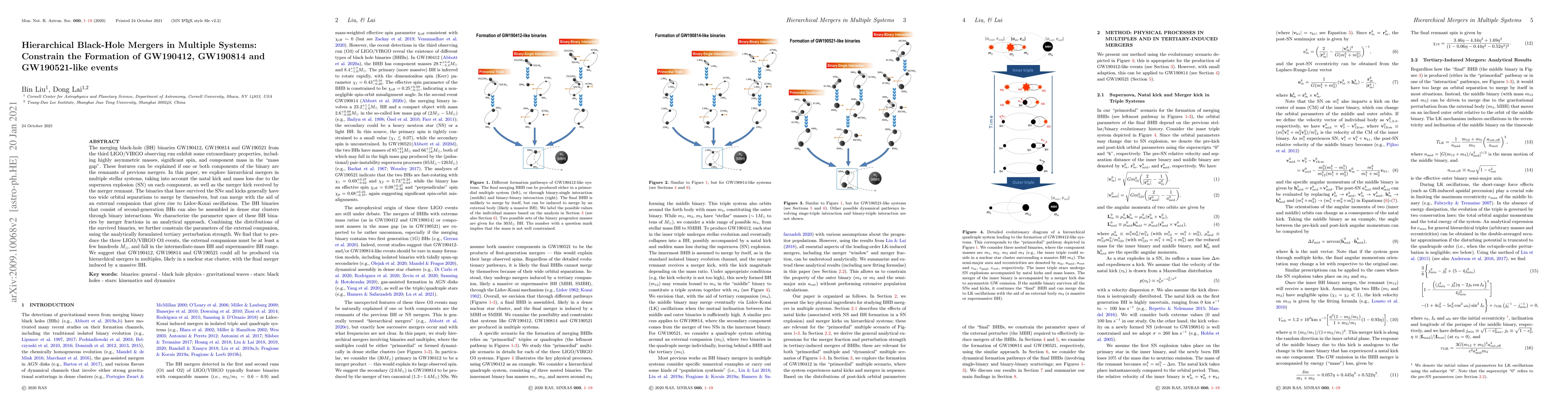 The merging black-hole (BH) binaries GW190412, GW190814 and GW190521 from the third LIGO/VIRGO observing run exhibit some extraordinary properties, including highly asymmetric masses, significant spin, and component mass in the "mass gap". These features can be explained if one or both components of the binary are the remnants of previous mergers. In this paper, we explore hierarchical mergers in multiple stellar systems, taking into account the natal kick and mass loss due to the supernova explosion (SN) on each component, as well as the merger kick received by the merger remnant. The binaries that have survived the SNe and kicks generally have too wide orbital separations to merge by themselves, but can merge with the aid of an external companion that gives rise to Lidov-Kozai oscillations. The BH binaries that consist of second-generation BHs can also be assembled in dense star clusters through binary interactions. We characterize the parameter space of these BH binaries by merger fractions in an analytical approach. Combining the distributions of the survived binaries, we further constrain the parameters of the external companion, using the analytically formulated tertiary perturbation strength. We find that to produce the three LIGO/VIRGO O3 events, the external companions must be at least a few hundreds $M_\odot$, and fall in the intermediate-mass BH and supermassive BH range. We suggest that GW190412, GW190814 and GW190521 could all be produced via hierarchical mergers in multiples, likely in a nuclear star cluster, with the final merger induced by a massive BH.