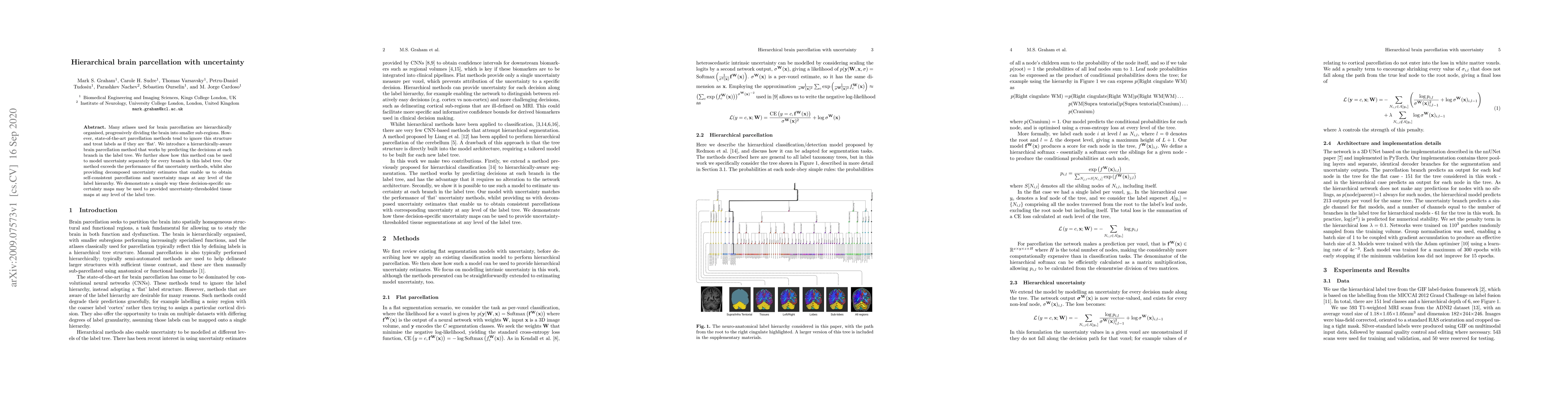 This paper proposes a hierarchically-aware brain parcellation method that predicts decisions at each branch of the label tree, outperforming flat methods by modeling uncertainty at each level. This approach provides self-consistent parcellations and uncertainty maps, enabling uncertainty-thresholded tissue maps at any level of the hierarchical label structure.
