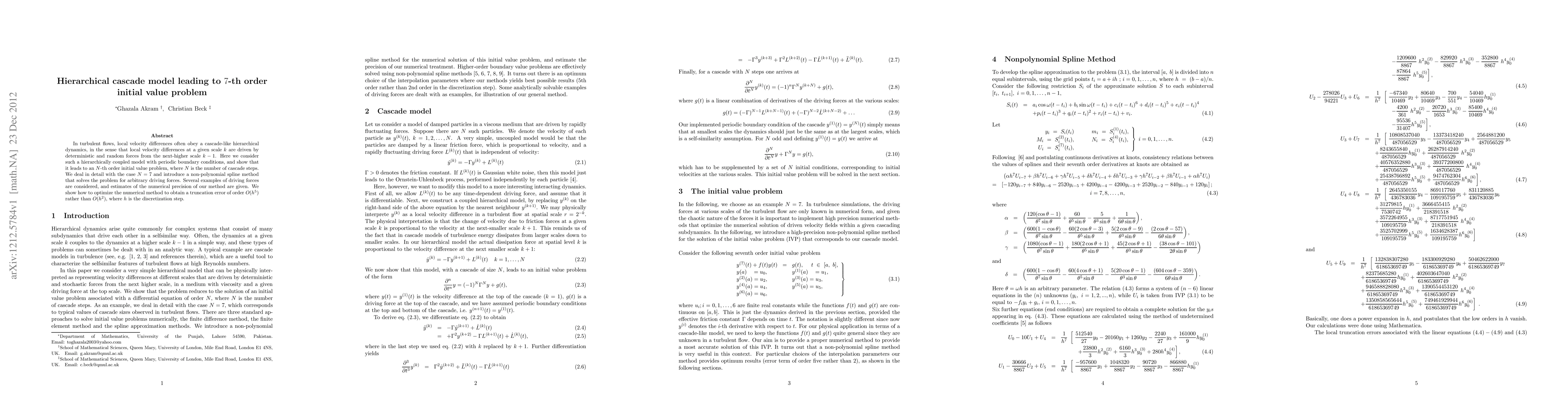 A hierarchical cascade model in turbulent flows leads to an N-th order initial value problem, where N is the number of cascade steps, requiring a non-polynomial spline method for solution.