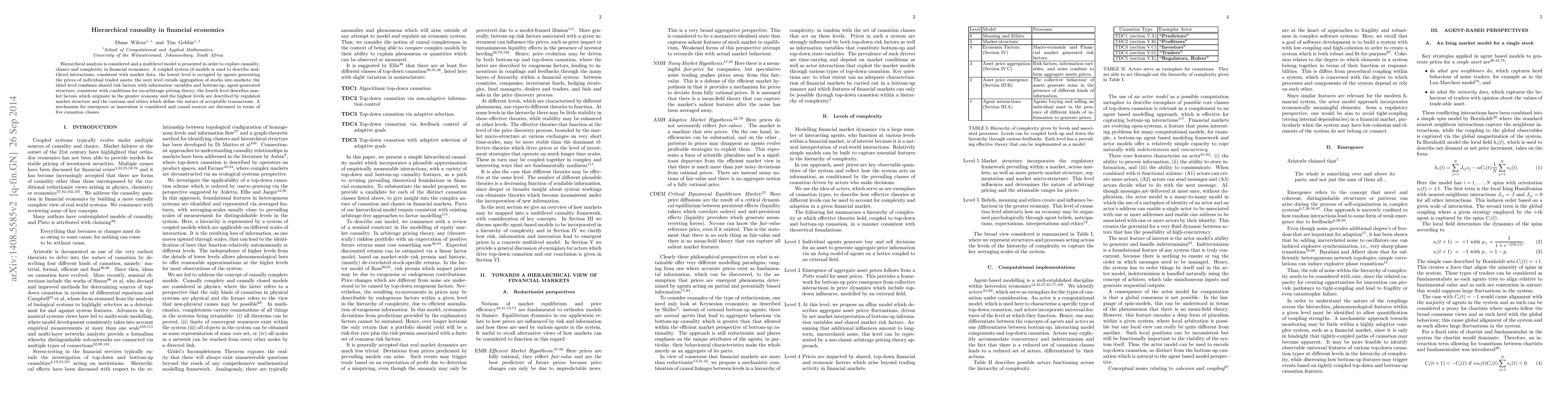 Hierarchical analysis is considered and a multilevel model is presented in order to explore causality, chance and complexity in financial economics. A coupled system of models is used to describe multilevel interactions, consistent with market data: the lowest level is occupied by agents generating the prices of individual traded assets; the next level entails aggregation of stocks into markets; the third level combines shared risk factors with information variables and bottom-up, agent-generated structure, consistent with conditions for no-arbitrage pricing theory; the fourth level describes market factors which originate in the greater economy and the highest levels are described by regulated market structure and the customs and ethics which define the nature of acceptable transactions. A mechanism for emergence or innovation is considered and causal sources are discussed in terms of five causation classes.