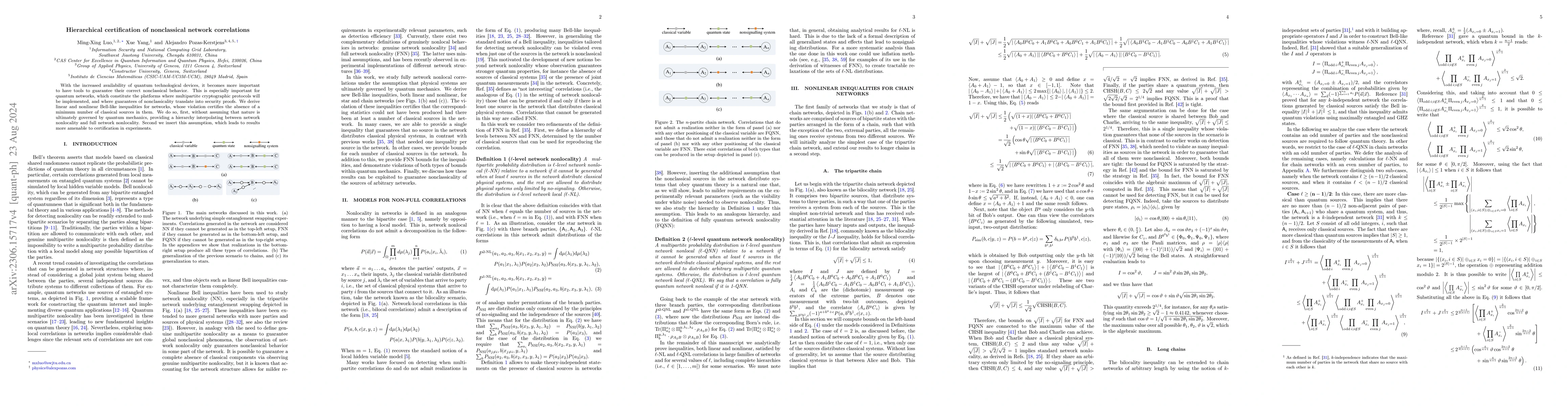 With the increased availability of quantum technological devices, it becomes fundamental to have tools to guarantee their correct non-classical behavior. This is especially important for quantum networks, which constitute the platforms where multipartite cryptographic protocols will be implemented, and where guarantees of non-classicality translate into security proofs. We derive linear and non-linear Bell-like inequalities for networks, whose violation certifies the absence of a minimum number of classical sources in them. We do so, firstly, without assuming that nature is ultimately governed by quantum mechanics, providing a hierarchy interpolating between network nonlocality and full network nonlocality. Secondly we insert this assumption, which leads to results more amenable to certification in experiments.